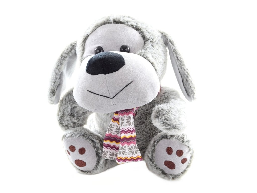Plyšový pejsek o rozměrech 18x25x16 cm.