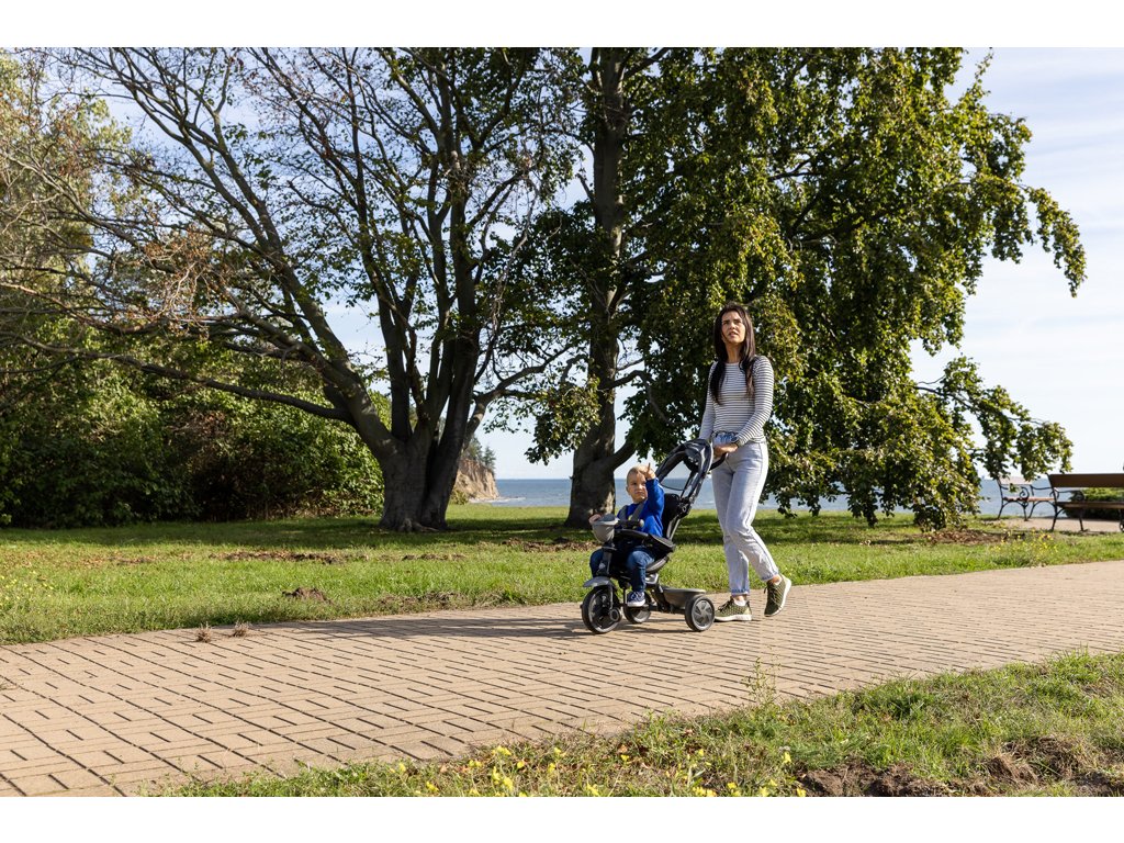 Přemění se z tříkolky s řidítky ovládané rodičem na samostatnou tříkolku.