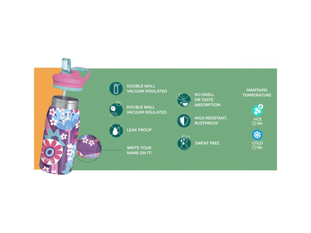 Dětská termoláhev Quokka Pop Kids z vysoce kvalitní dvoustěnné oceli udrží nápoj i během horkých letních dní příjemně studený. Láhev s pítkem a brčkem umožňuje snadné pití bez nutnosti naklánění láhve. Zaklapávací pítko brání vylití obsahu láhve. Široké hrdlo umožňuje vložení kostek ledu a zároveň se díky němu láhev snadno čistí. Údržbu usnadňuje i odnímatelné široké brčko. Díky držadlu se láhev snadno přenáší. Termoláhev udrží teplotu studeného nápoje až 10 hodin, při vložení kostek ledu až 18 hodin. Na spodní části láhve je prostor pro napsání jména nebo nakreslení obrázku, aby nedošlo k záměně ve školce či ve škole.