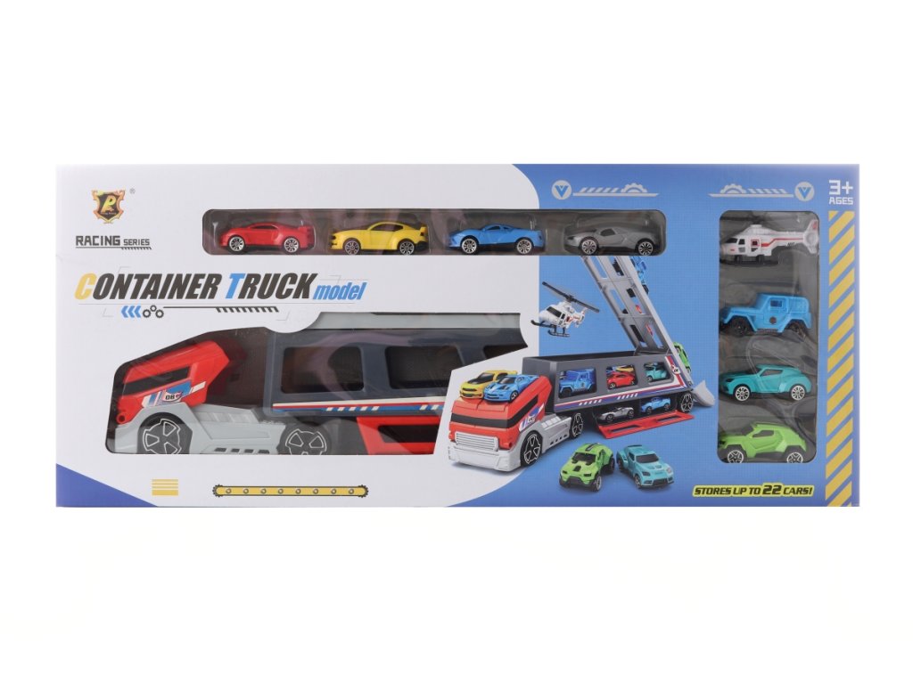 Sada obsahuje kamion, 7 autíček a 1 helikoptéru.