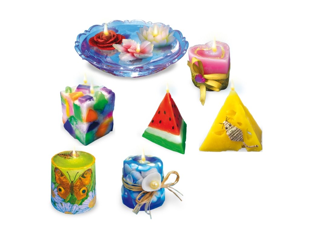 S tímto velkým balením si můžete vyrobit až 9 svíček v pohodlí domova. Různé barvy a tvary svíček (srdce, melounová, mořská, plovoucí, sýr a myš, mozaika atd.). Balení obsahuje vše potřebné pro výrobu (parafín, odlévací formy, barvivo, knoty, akrylové barvy, lepidlo, třpytky, skleněné korálky, saténové stuhy atd.). Sada obahuje např. voskový základ, šablony, kelímky, formičky, drátek, korálky, mušličky, ozdobný ubrousek, barvy, stuhu, lepidlo, provázek, voskovky a plno dalšího. Rozměr balení 30 x 44 x 6 cm. Věk 7+. VYROBENO V EVROPĚ