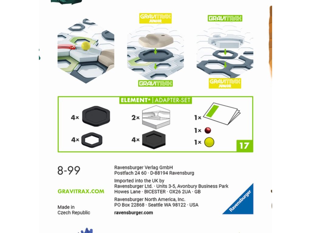 Sada obsahuje celkem 17 dílků, z toho 4 adaptéry GraviTrax, 4 adaptéry GraviTrax Junior, 2 spojovací kameny, kuličky, výškové destičky a návod.