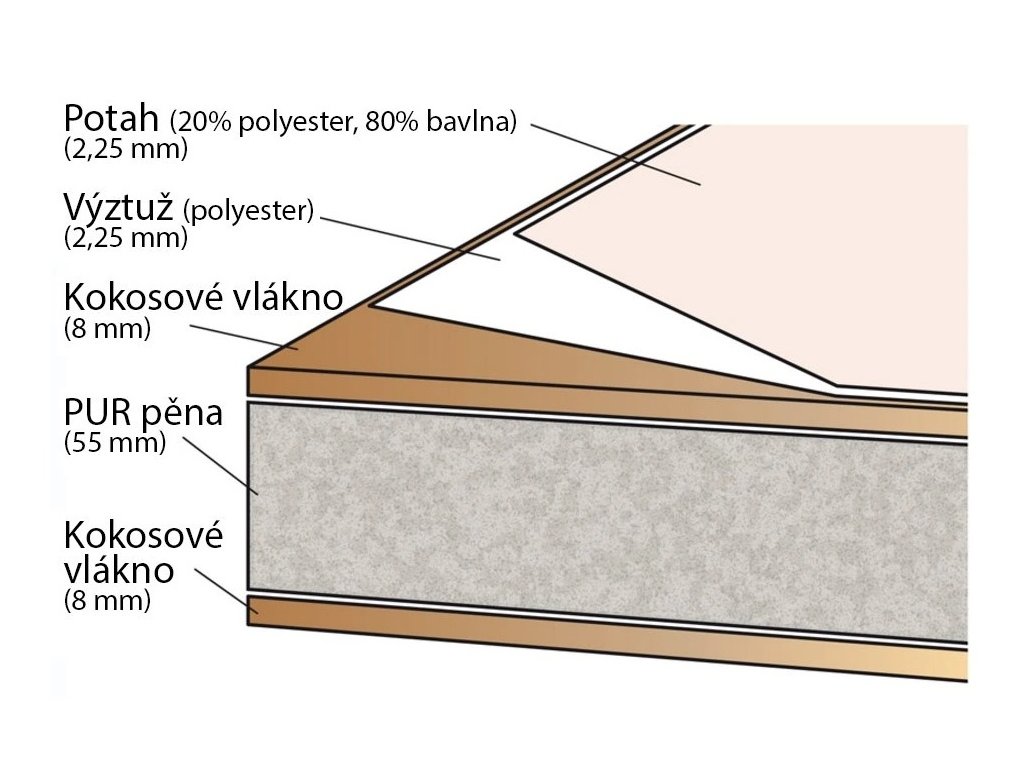 Kokosové vlákno + PUR pěna + kokosové vlákno