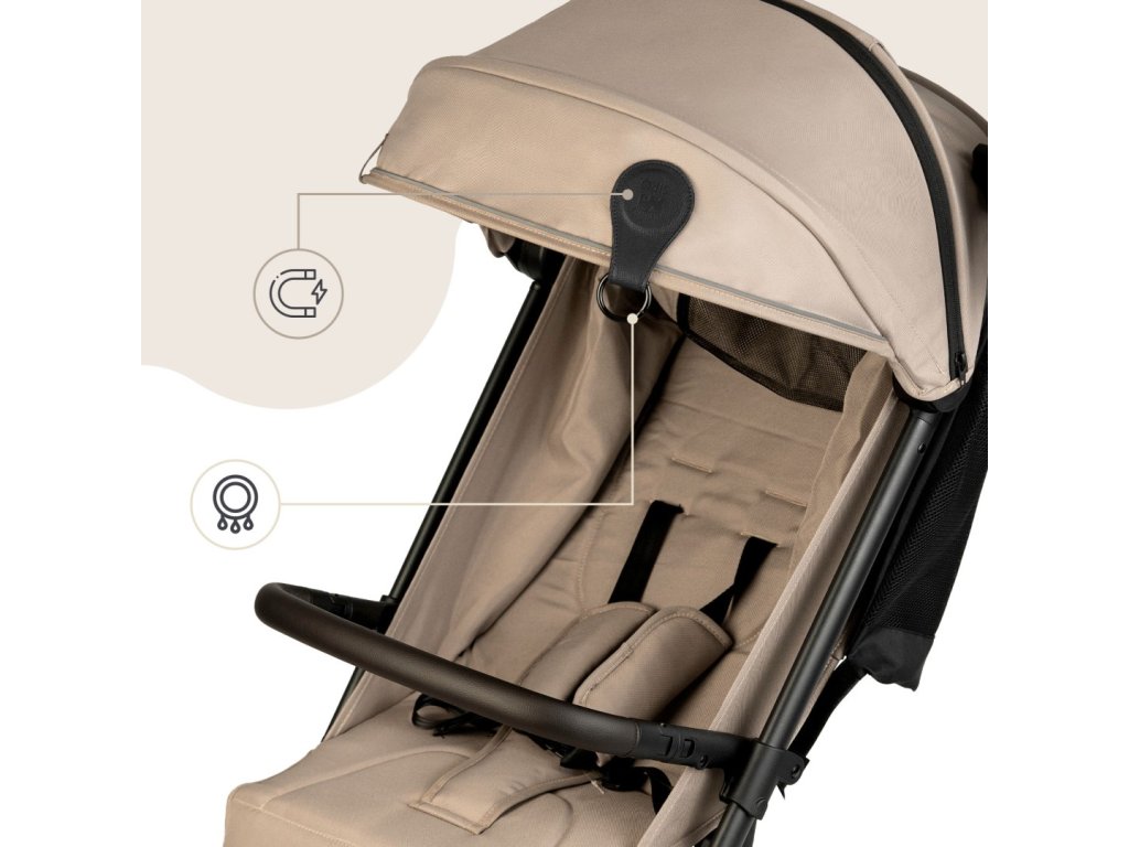 Doporučeno pouze pro použití s lehkými, prodyšnými látkami, které neomezují proudění vzduchu kolem dítěte – jako je bavlna, mušelín nebo síťovina. Úplné zakrytí kočárku vzduchotěsnými materiály může způsobit přehřátí a nedoporučuje se. Pokud jsou spony znečištěné, lze je otřít vlhkým hadříkem – nepoužívejte agresivní čisticí prostředky. Není vhodné pro praní v pračce ani mytí v myčce nádobí.