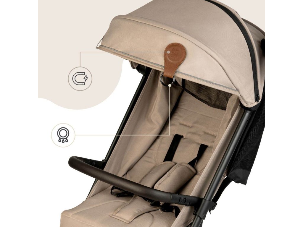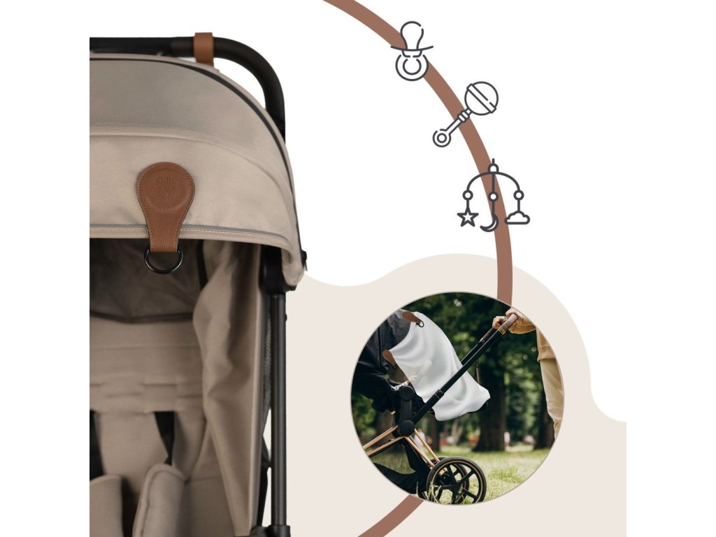 Doporučeno pouze pro použití s lehkými, prodyšnými látkami, které neomezují proudění vzduchu kolem dítěte – jako je bavlna, mušelín nebo síťovina. Úplné zakrytí kočárku vzduchotěsnými materiály může způsobit přehřátí a nedoporučuje se. Pokud jsou spony znečištěné, lze je otřít vlhkým hadříkem – nepoužívejte agresivní čisticí prostředky. Není vhodné pro praní v pračce ani mytí v myčce nádobí.