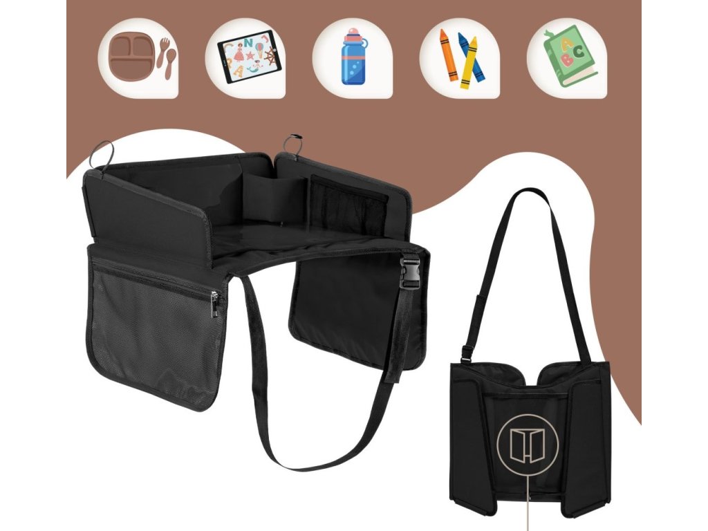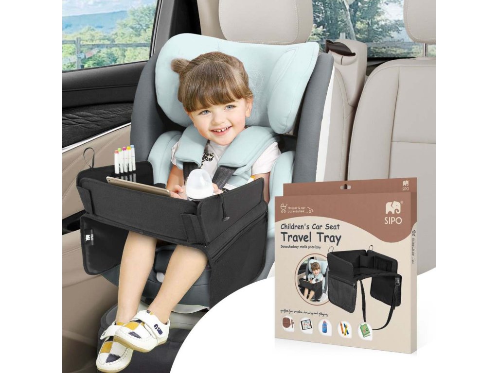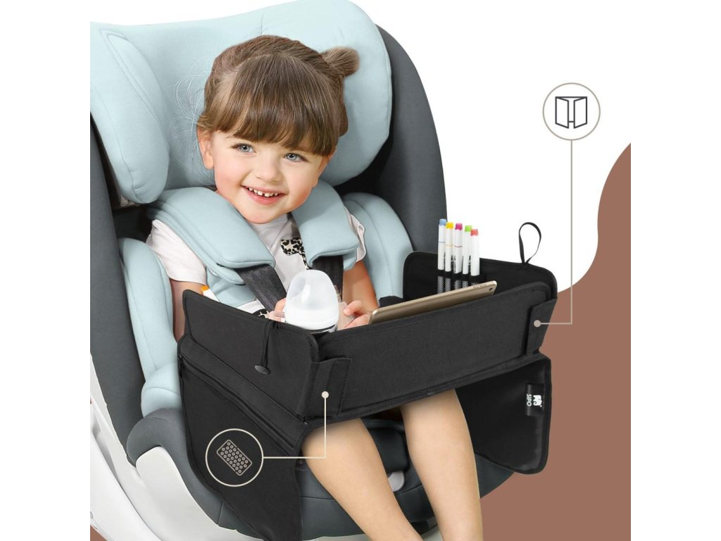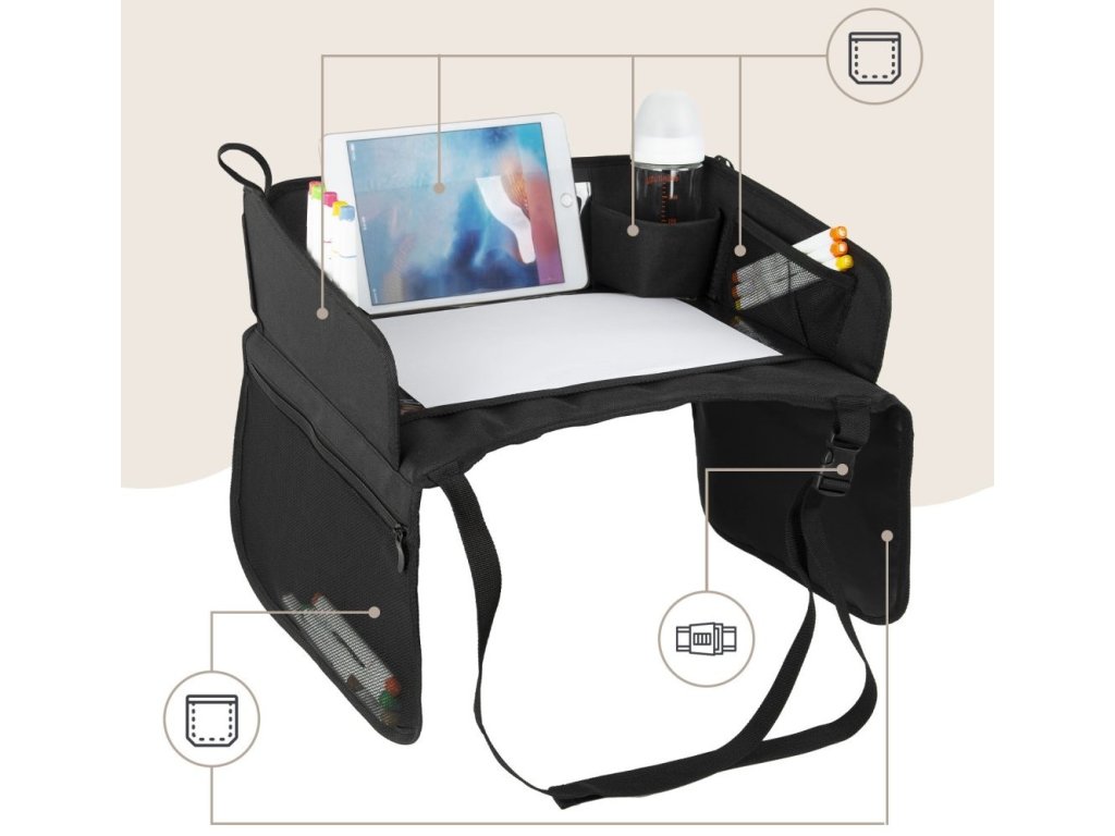 Stolek je vybaven průhlednou kapsou na tablet, do které se vejdou zařízení až do velikosti 11 palců, a umožňuje tak bezpečné a pohodlné sledování kreslených filmů během jízdy. Součástí je také držák na nápoje a praktické boční kapsy pro uložení školních potřeb, hraček, kapesníků nebo svačinek. Vysoké skládací boční stěny zabraňují vypadávání drobných předmětů a nastavitelné bezpečnostní popruhy zajišťují stabilitu stolku i na nerovných silnicích. Lehký, skládací a snadno přenosný – je to perfektní společník na cesty.