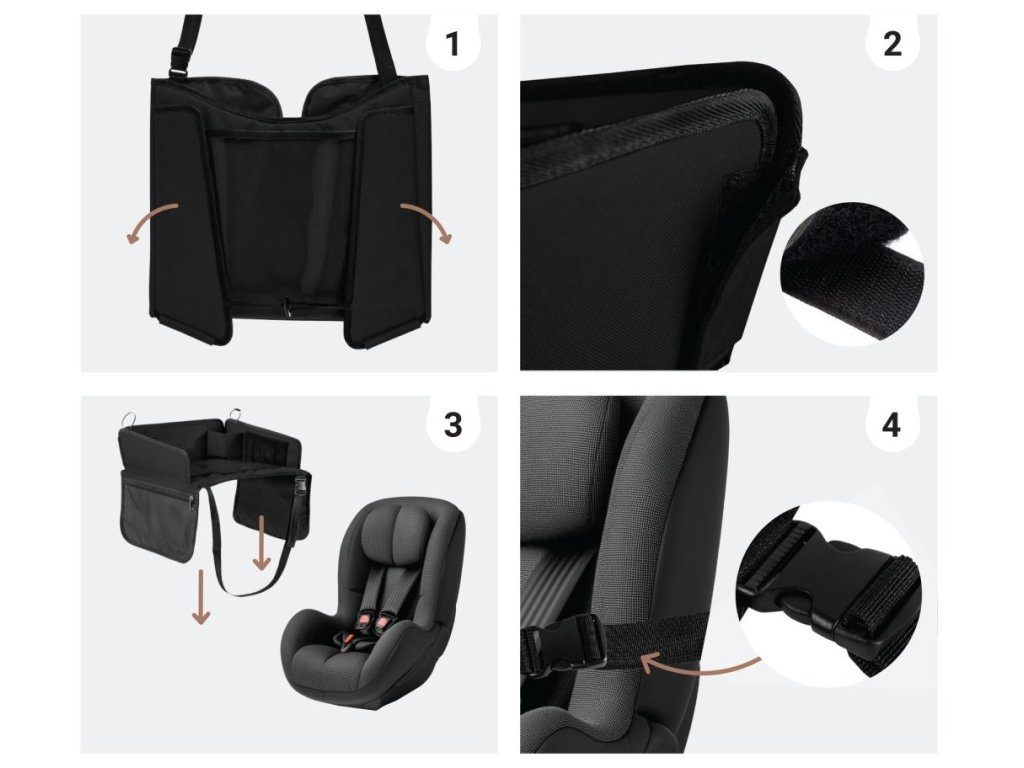 Umístěte stolek na klín dítěte, když sedí v autosedačce nebo na podsedáku. Poté provlečte bezpečnostní popruh kolem zadní části sedadla a zapněte sponu. Upravte popruh tak, aby byl stolek stabilní, ale neomezoval pohyb dítěte. Po použití rozepněte popruh a stolek složte do kompaktní podoby.