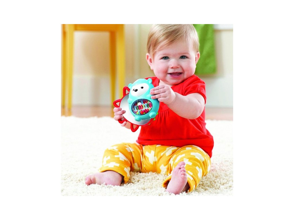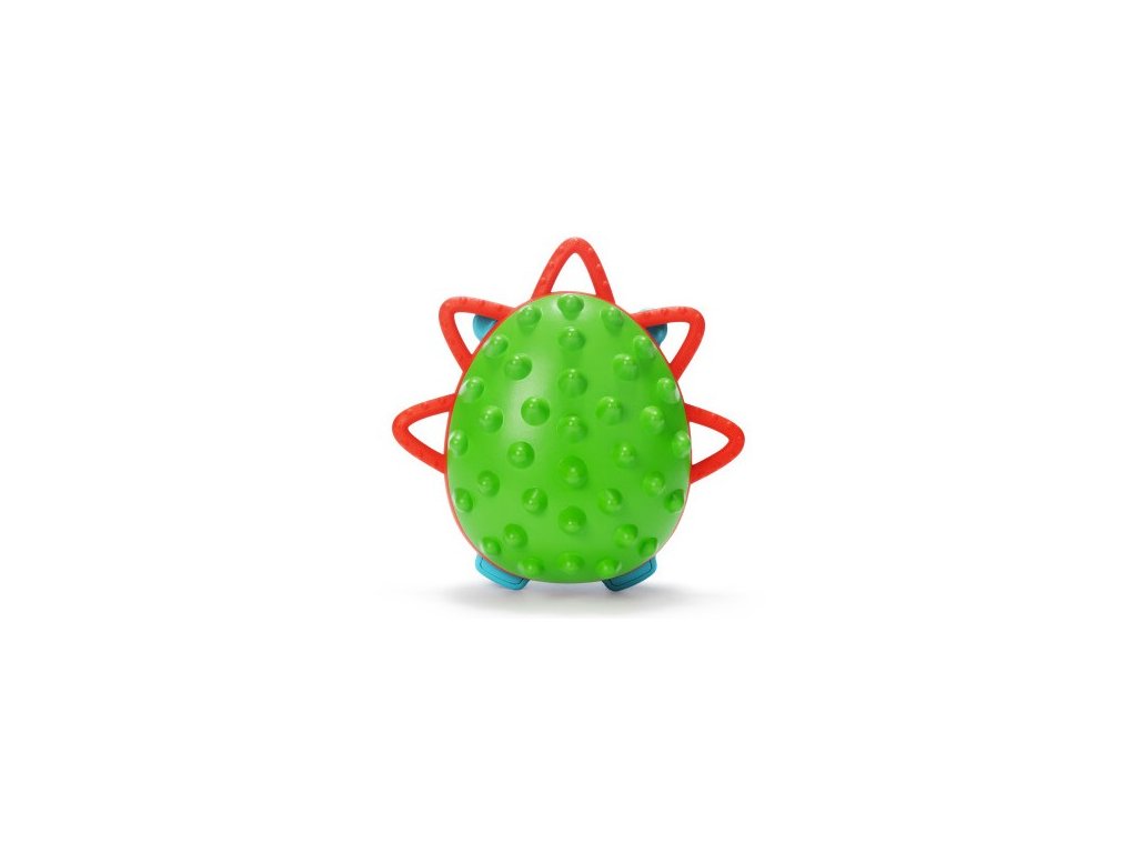 Ježečku, ježečku, co v sobě ukrýváš : barevné chrastítko na bříšku, když mnou pootočíš, objevíš pod bodlinkami dětské zrcátko, po straně mám kousátka ve tvaru bodlinek.