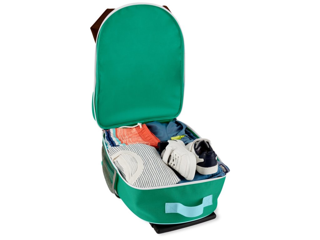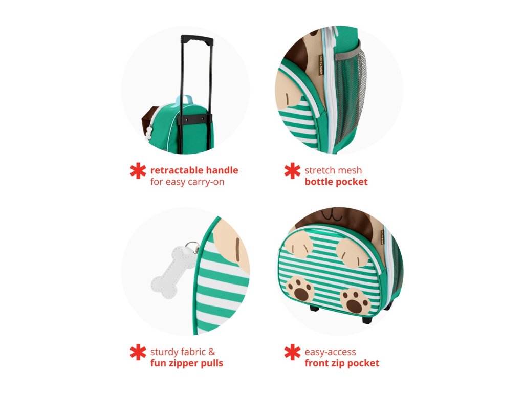 Kufr má přední kapsu s malou kapsičkou, která je ideální pro věci, jenž chce mít Vaše dítě při ruce, jako např. oblíbené hračky či pastelky. Hlavní kapsa pak poslouží na uložení oblečení, knížek apod. Nechybí pak ani sí'tovaná kapsa na boční strane. Dětský kufr od firmy Skip Hop má kolečka a vytahovací rukojeť až o 33 cm. Na zadní straně kufru je také štítek pro napsání jména, aby se neztratil mezi ostatními kamarády ze Zoo.
