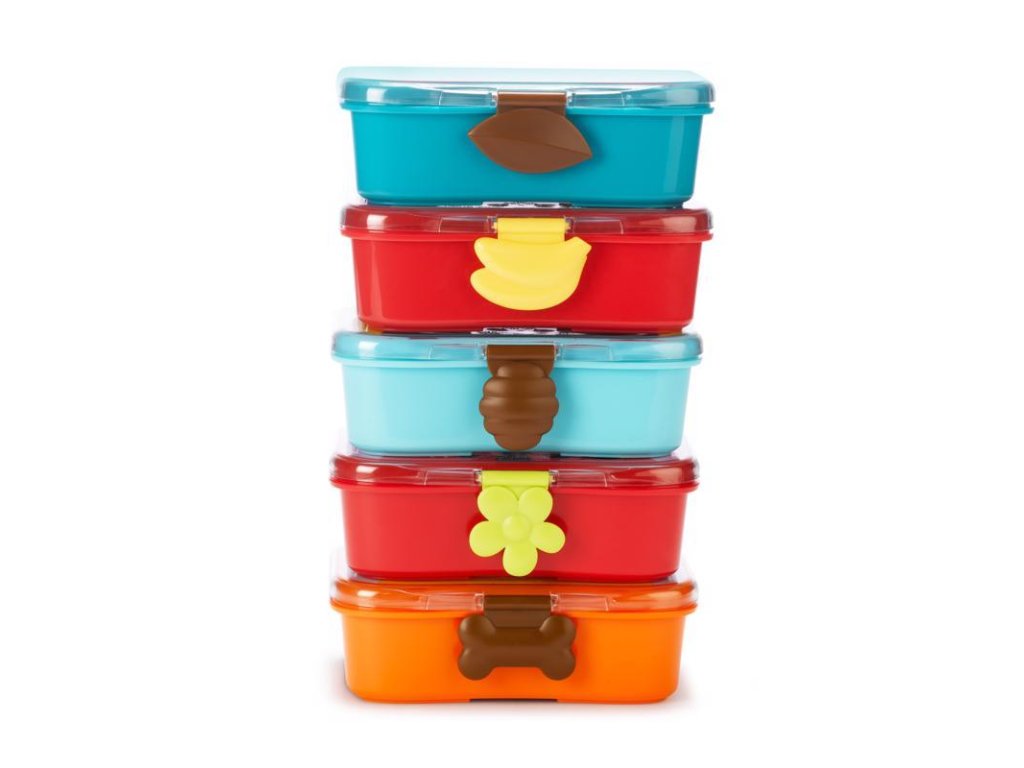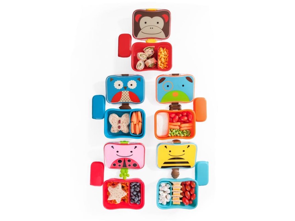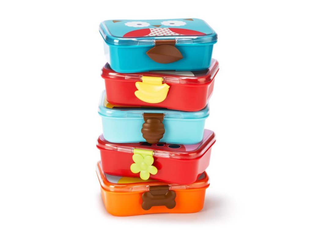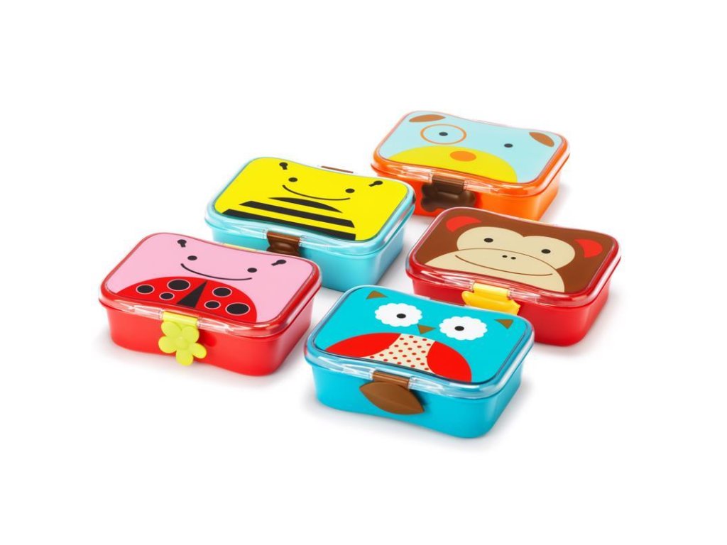 Krásná krabička na svačinu ve stylu Skip Hop, v designu Zoo kolekce, skládá se ze 2 dílů: krabička na svačinu s nepropustným víčkem a menší krabička na piškoty.