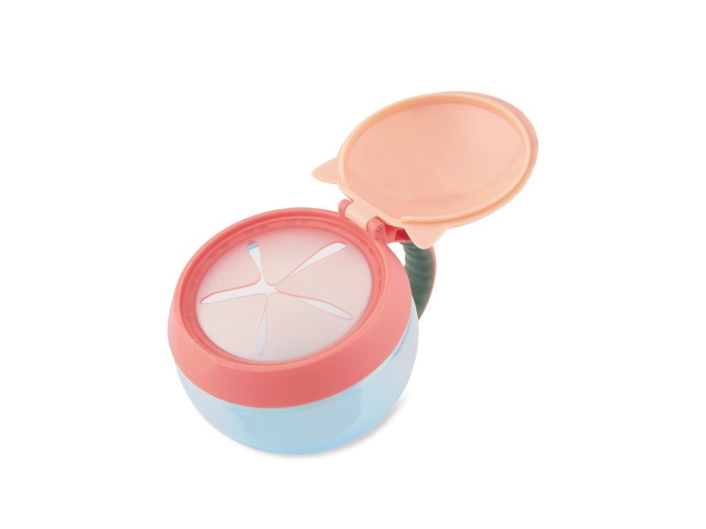 Chytrý nápad na cesty. Kalíšek má víčko, které po otevření drží, před vysypáním obsahu jej chrání pružné lamely, které pustí dětskou ručičku dovnitř, ale nepustí svačinku ven. Kalíšek je průhledný, aby se mohl zavčasu doplnit. Na boku je praktické ouško v dětském rozměru, pomocí kterého lze kalíšek připevnit i na kočárek či tašku. 0 % BPA, 0 % PVC, bez ftalátů. Obsah: 222 ml. Průměr: 10 cm