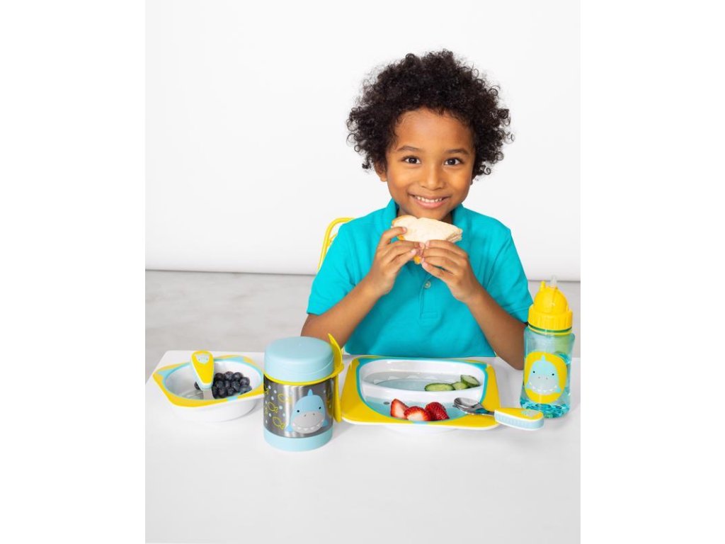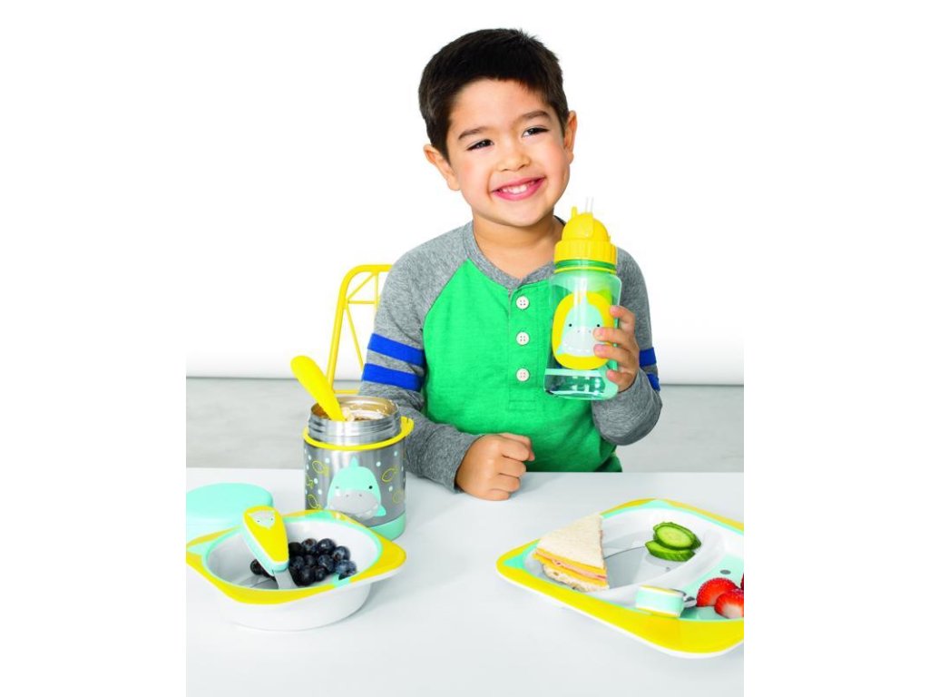 - možnost sladit s širokou nabídkou produktů značky Skip Hop z kolekce Zoo jako jsou například nerezové láhve s brčkem, nádoby na sušenky až po batůžek do školky - ve srovnání s konkurencí je součástí balení vidlička / lžička s držákem a moderním dětským motivem.