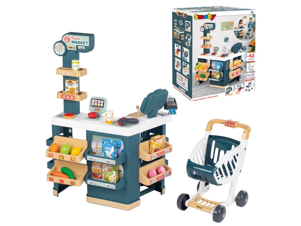 Supermarket s pokladnou, oddělením ovoce /zelenina, váhou (nová mechanická váha: zobrazená hmotnost se upravuje podle vážených potravin). Dítě může nastavovat hodiny a panel otevřeno/zavřeno. Obsahuje 42 doplňků: těstoviny, sušenky, cereálie, mléko, 6 kusů ovoce a zeleniny, 1 koláč, 2 makronky, 2 plechovky, 1 elektronický snímač čárových kódů se zvukem a světlem, 1 kreditní karta, 4 účtenky, 9 mincí a 12 bankovek. Pokladna má zásuvku na peníze, mikrofon a čtečku kreditních karet. Vozík součástí.Obchod elektronický s váhou Super Market od francouzského výrobce Smoby představuje perfektní dárek pro chlapce a dívky od 3 let. Supermarket je zhotoven v originálních barevných odstínech modré, bílé a béžové, díky kterým ozdobí každý dětský pokoj. Obchod disponuje pokladnou, mechanickou váhou pro vážení zboží, platebním terminálem, hodinami, mikrofonem a elektronickým skenerem zboží, které po zatlačení tlačítka svítí a vydává zvuky. Je to malá replika skutečného Supermarketu se spoustou zboží, které si uloží do poliček a boxů.Platit v obchodě lze i kreditní kartou prostřednictvím platebního terminálu, ze kterého následně obdrží nakupující kartičku – pokladní blok se seznamem nakoupeného zboží. Mince a bankovky mají své místo v integrované kase na pokladním pultu. Hrou na obchod se děti seznamují s principem počítání a učí se pochopit hodnotu peněz. Při nákupu si děti zboží vkládají do nákupního vozíku na kolečkách, a tak jako ve skutečném obchodě, i zde musí vložit do košíku minci. Celkem se v dětském obchodě nachází až 42 doplňků, mezi nimiž jsou krabice s potravinami, ovoce, zelenina, koláčky, nápoje, mince a bankovky.O tom, zda je Supermarket otevřený nebo zavřený, informuje oznámení otevřeno/zavřeno (v angličtině a francouzštině), které dítě nastavuje podle otevíracích hodin. Celkové rozměry Supermarketu jsou 60*60*90 cm, jeho celková výška je 90 cm. Dětský obchod Super Market je vhodný i pro hru více dětí, kamarádů a sourozenců. Při hře si rozvíjejí komunikační a jazykové dovednosti, učí se logicky přemýšlet, objevují hodnotu peněz. Při manipulaci s doplňky si procvičují jemnou motoriku a pohybovou zručnost. Zahrají si hry na obchodníky a zákazníky, přibližují se světu dospělých a získávají pocit zodpovědnosti. Také se probouzí jejich tvořivost a fantazie.Francouzský Smoby přináší dětem prvotřídní hračky s vlastním originálním příběhem. Materiál na hračkách Smoby je pevný, odolný, ale zároveň jemný a hladký k dětským ručkám. Všechny dětské hračky mají oblé hrany, aby vaše děti byly během veselých her v bezpečí a chráněny před zraněními. Produkty Smoby všestranně rozvíjejí vaše děti, formují jejich osobnost, upoutají každé i nejmenší děťátko. Hračky splňují i ta nejvyšší bezpečnostní kritéria a jsou zárukou špičkové francouzské kvality a moderního vzhledu.Doplňkové parametry