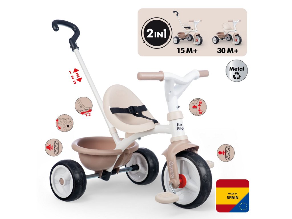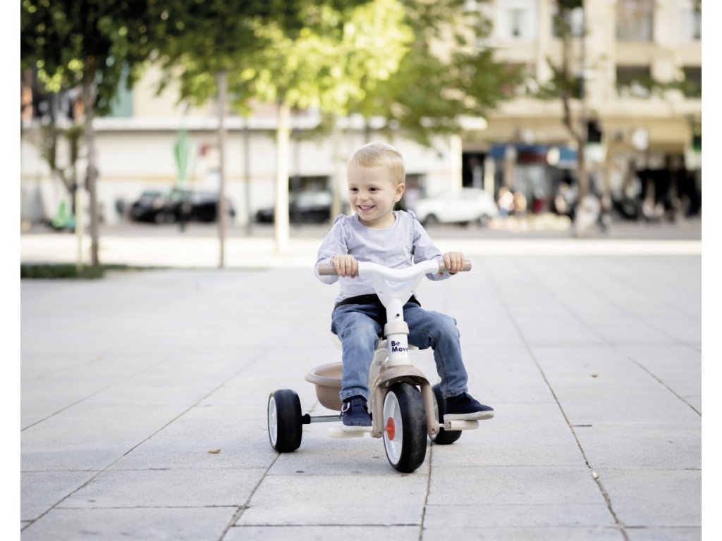 Jedinečná béžová tříkolka Be Move Tricycle od francouzské značky Smoby představuje dokonalý způsob, jakým rozhýbat děti od 15 měsíců. Na originální tříkolce s celokovovým rámem budou děti objevovat okolní svět a zároveň si budou užívat příjemné, bezpečné jízdy. Odolná konstrukce tříkolky je zárukou, že vydrží vašemu dítěti po dlouhá léta. Tichá a odolná EVA kolečka jsou vyrobena ze speciálního materiálu a vyznačují se skvělými jízdními vlastnostmi. V kolečkách se snoubí výhody tichých gumových koleček a odolného plastu, takže jízda na tříkolce bude tichá a bezpečná. Tříkolka dokáže růst s dítětem a přizpůsobovat se jeho potřebám.
