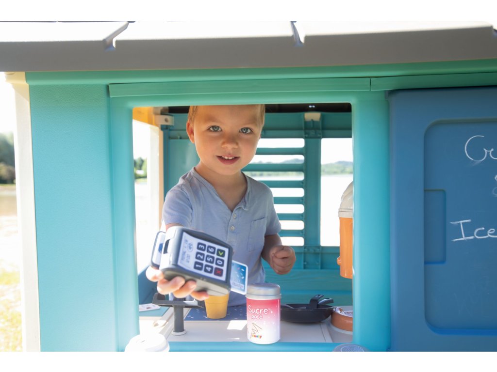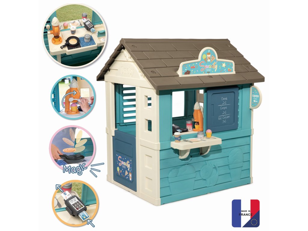 Dětský domeček poslouží dětem zároveň i jako cukrárna nebo obchůdek se sladkostmi – na střeše je emblém s obrázky sladkostí a nápisem Sweety Corner, stejný nápis je i na polovičních dvířkách. Výdejní okénko je vybaveno pultíkem z vnější strany obchůdku, z vnitřní strany se nachází pult s otevíratelnou pokladnou a dávkovačem zmrzliny. Na posuvnou okenici si mohou malí obchodníci napsat ceny a po ukončení prodeje ji jednoduše zatáhnout. Při obsluze a přípravě pochoutek se děti spolehnou na sadu 18 doplňků, ve které najdou platební terminál, platební kartu, pokladní doklady, kávu v kelímku, sladké drobenky, 2 kornouty s kopečkem zmrzliny, talířek s příborem, pánev s funkcí otáčení a 2 palačinky.