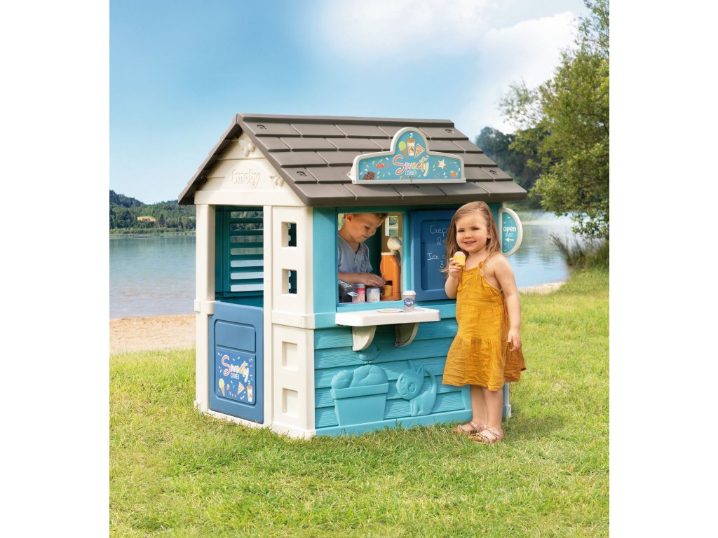 Domeček s obchodem Sweety Corner Playhouse od francouzského výrobce Smoby představuje skvělý dárek pro všechny chlapce a dívky již od 2 let. V přední části domku se nacházejí poloviční dveře, boční stěny jsou vybaveny 2 okny se žaluzií a 1 posuvnou okenicí, takže si v něm budou děti užívat příjemný vánek i během horkých letních dnů. Domeček v barevné kombinaci modré, bílé a šedé působí moderně a nadčasově, ozdobí každou zahradu a dvůr, díky anti UV filtru jeho barvy nevyblednou ani po letech používání.