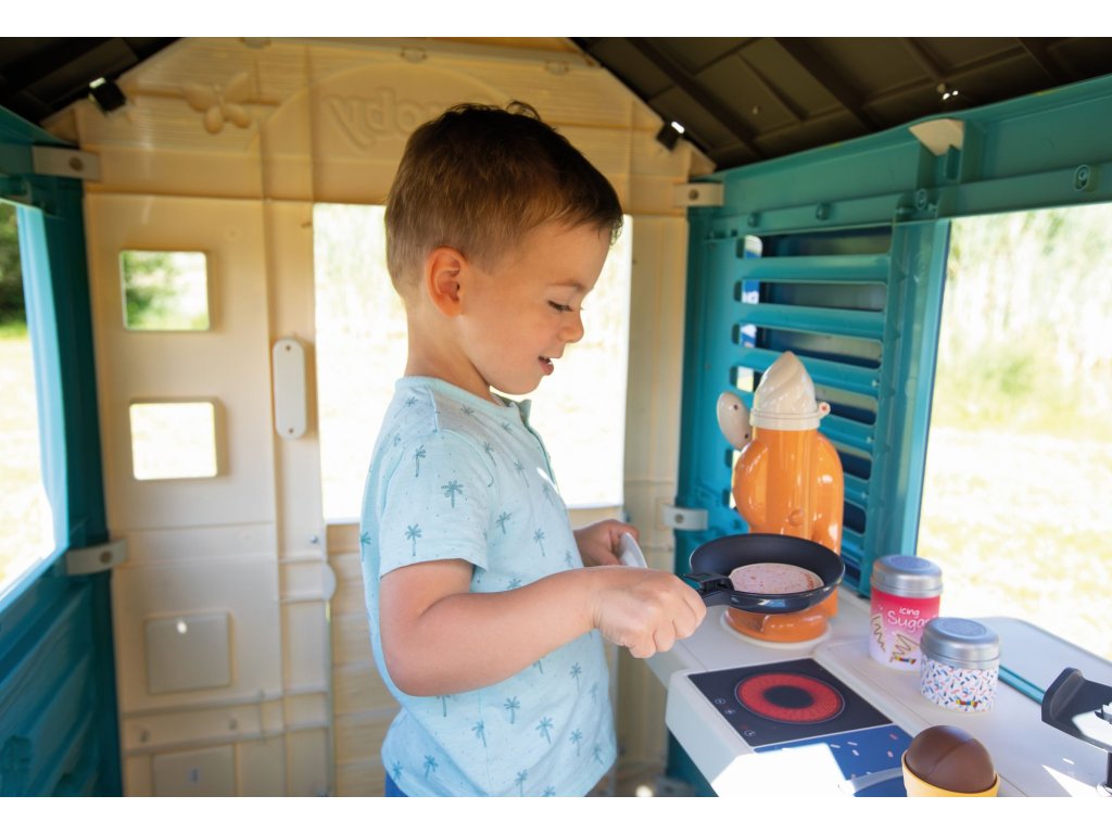 Stabilní, prostorný domeček Sweety Corner s výdejním okénkem pro dobroty sebou. S polovičními vstupními dveřmi , 2 okny s okenicemi, které lze posouvat a využít k napsání jídelníčku. Domeček má pult pro příjem objednávek od zákazníků a ve vnitřní straně má pult pro přípravu palačinek, zmrzliny a nápojů. Součástí je 18 ks příslušentsví, např. talířek, vidlička, nůž, 2 palačinky, cukřenka, pokladní doklady, kreditní karta atd. Vyrobeno z kvalitního, pevného, UV záření odolného plastu, snadné sestavení.