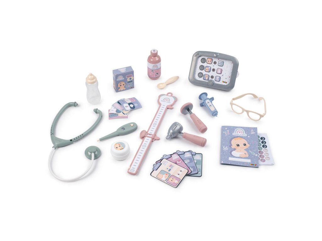 Skládá se z několika herních ploch a obsahuje spoustu doplňků: samolepící lékařský štítek, lékařské brýle, elektronický tablet (baterie nejsou součástí dodávky), otočná obrazovka s testem zraku a srdečního tepu, brožurka zdravotních záznamů a lékařské formuláře. Součástí je i dětská váha, teploměr, vyšetřovací stůl , stetoskop, otoskop a další.