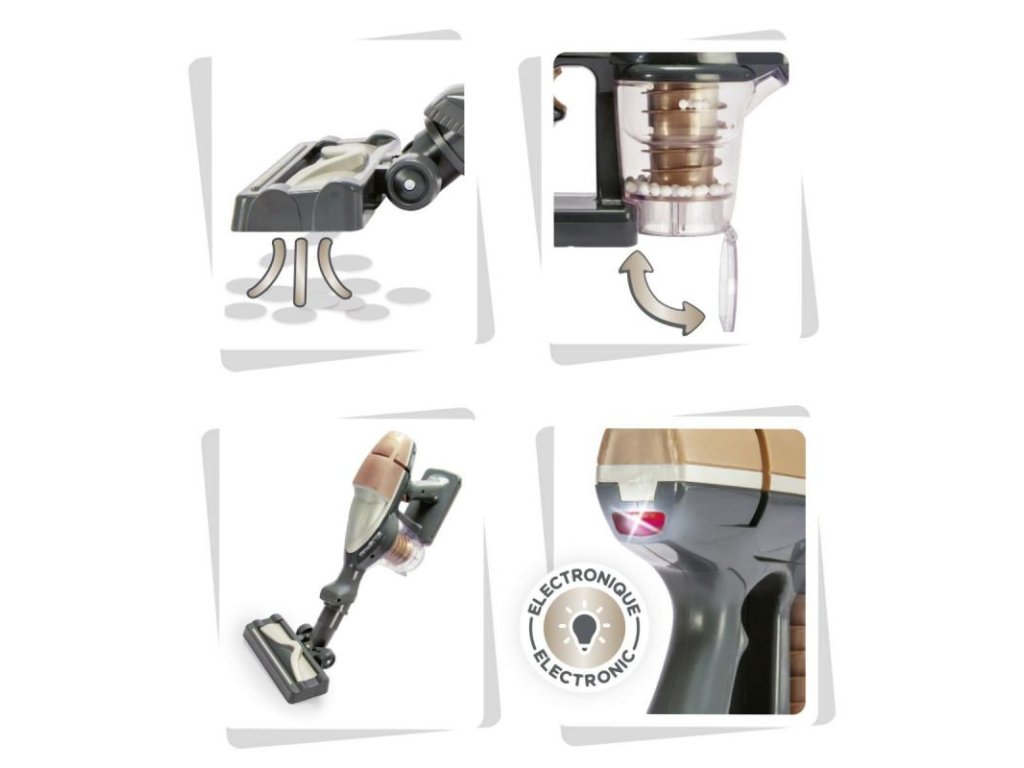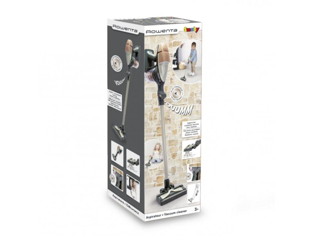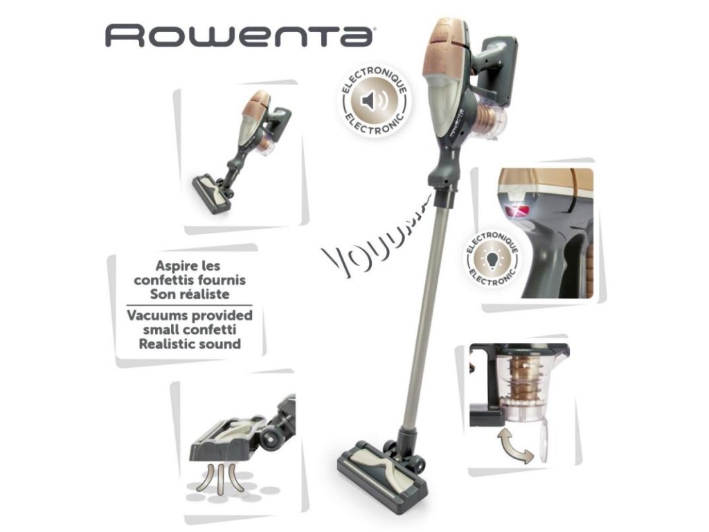 Tyčový vysavač Rowenta Air Force Vacuum Cleaner z dílny francouzských návrhářů Smoby je vynikající dárek pro děti od 3 let, které se mohou těšit na zábavné vysávání ve svém pokojíčku. Dětský vysavač dokáže vydávat zvuky a svítí, díky čemuž působí velmi realisticky. Při zapnutí vysavače LED kontrolka upozorňuje na to, že je vysavač zapnutý a děti se mohou těšit na zvuk vysávání. Nádobu na prach lze po skončení otevřít a vyprázdnit – součástí jsou i kuličky, které vytvářejí při hře ještě realističtější zážitek. Svými rozměry 75*15*8 cm a nízkou váhou je vhodnou hračkou pro děti, které chtějí doma pomáhat.