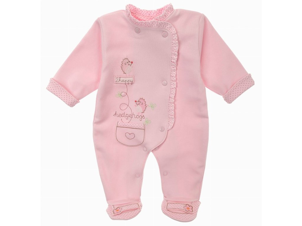 Zapínání na přední části i mezi nožičkami na patentky. Overal s dlouhými rukávy má okrasné obšití kolem zapínaní a krku, růžové značkové patentky a překrásná výšivka.