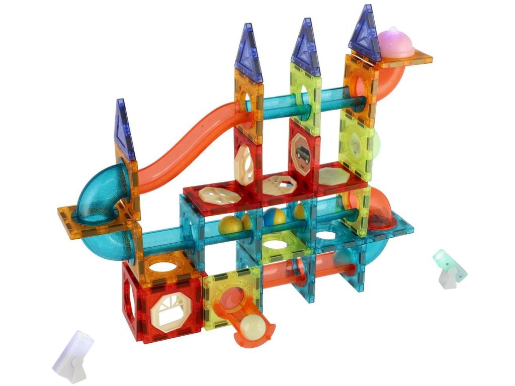 Sestavte si z magnetických dílků barevnou kuličkovou dráhu se světelnými efekty. Stavebnice rozvíjí jemnou motoriku a trénuje soustředění a zručnost. Tato sada obsahuje 100 ks + 16 kuliček. Doplňky jsou na baterie, které jsou součástí balení a jsou nevyměnitelné.