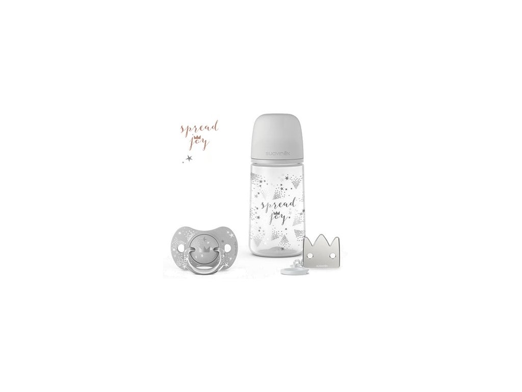 SUAVINEX SADA Láhev 270ml + dudlík fyziologický 0-6m + Klip JOY - Stříbrná