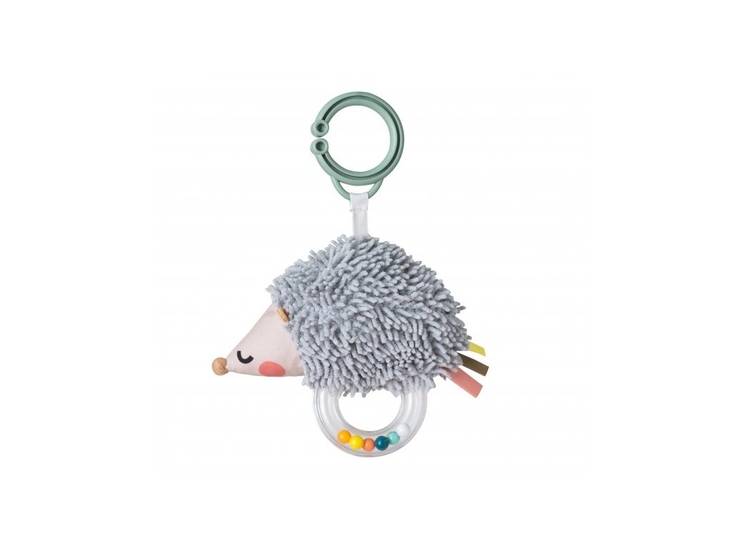 Chrastítko tvoří měkká plyšová hračka v podobě střapatého ježka Spikeho a průhledný plastový kroužek naplněný barevnými korálky.
