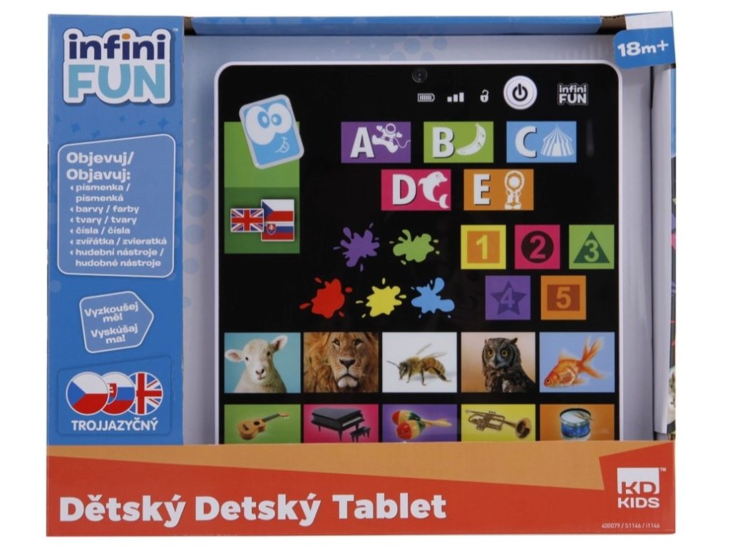 Díky tomuto trojjazyčnému tabletu se děti mohou učit, aniž by uměli číst nebo psát. Tablet obsahuje jednoduché a zábavné hry pro předškolní děti.