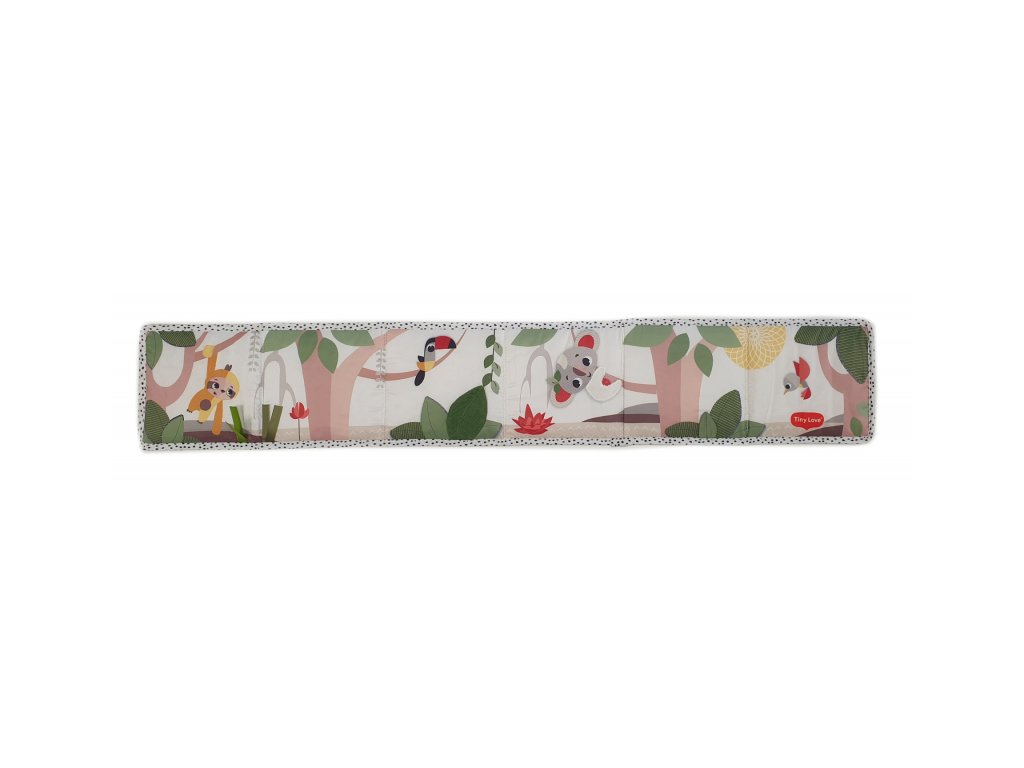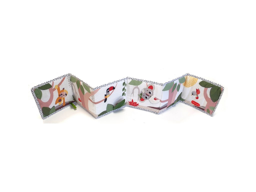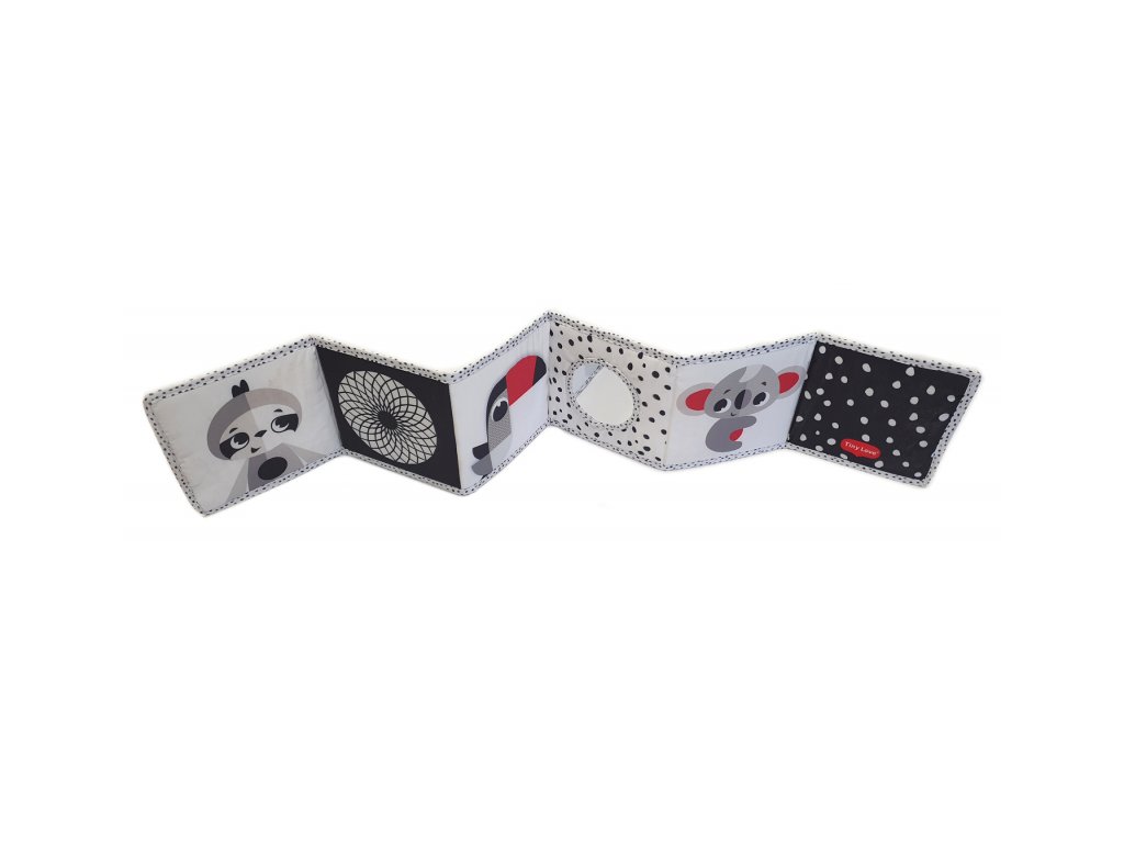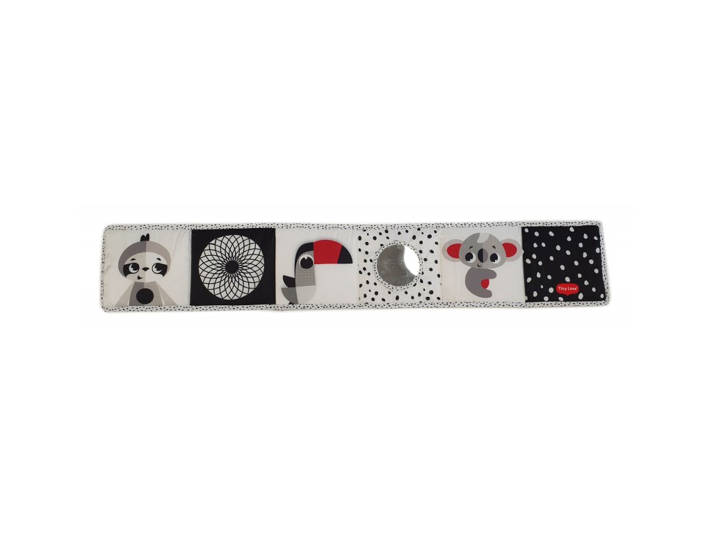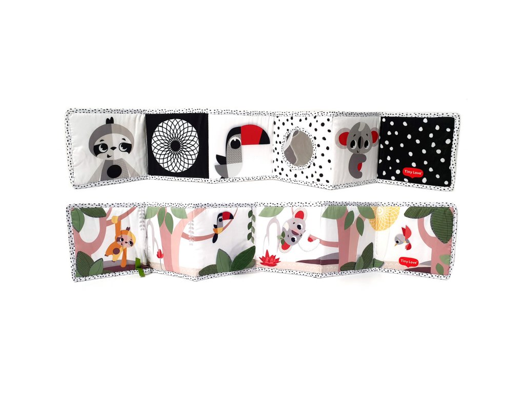 Oboustranná textilní knížka pro nejmenší Tiny Love je určena do kočárku, postýlky i na hrací deku. Kniha nabízí dvě strany pro dvě vývojová stádia dítěte: 0-3 měsíce: strana s bezpečným zrcátkem a vysoce kontrastními, jednoduchými obrázky v základních barvách, které podněcují rozvoj smyslů a emoční inteligence dítěte. Od 3 měsíců: strana s barevnými obrázky a různorodými texturami ke zkoumání, které podporují rozvoj smyslů a jemné motoriky dítěte.