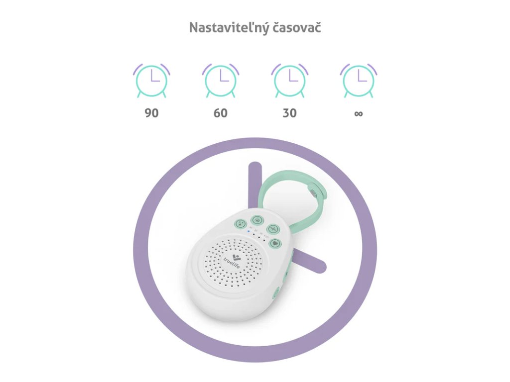 Široký repertoár pro klidné uspáváníMiminka snáze usnou, když uslyší příjemný zvuk a TrueLife BabyTone S3 jich nabízí hned 20. Na výběr máte 5 melodií, 9 zvuků přírody, 5 zvuků bílého šumu či tlukot srdce. Srdeční tep miminko zklidňuje už v prenatálním období a po narození mu připomíná bezpečí. Zvuk, který si miminko oblíbí, zní z kvalitního reproduktoru ve smyčce, dokud zařízení manuálně nebo za pomoci časovače nevypnete. Časovač lze nastavit na 30, 60 nebo 90 minut. Oblíbený zvuk není třeba vždy hledat, poslední použitý zůstane v paměti a po zapnutí se hned přehraje, takže si jen nastavíte potřebnou hlasitost.Doma i na cestyPřenosný uspávací modul výborně poslouží k uspávání miminka doma i na cestách. Pomocí odnímatelného poutka jej jednoduše zavěsíte na postýlku, kočárek nebo sedačku v autě. Právě při cestování autem oceníte, že stačí jediný pohyb ke spuštění ukolébavky, a tedy klidnější jízdu. Baterie vydrží až dlouhých 100 hodin, takže se není třeba obávat, že by v nevhodnou chvíli přestal usínáček fungovat. Následně stačí dobít pomocí USB-C.Jednoduché a bezpečné použitíŠikovné ručičky zvědavých dětí se mohou dostat až k usínáku, proto je dobré mít nastaven dětský zámek, který dovolí dítěti zkoumat své okolí bez přepínání nastaveného zvuku. Tento malý a lehoučký modul, který v sobě ukrývá velkou sílu, je vyroben z nezávadných plastů bez obsahu BPA. Jeho použití je tedy nejen bezpečné, ale také velmi jednoduché a intuitivní, stačí 4 tlačítka pro nastavení různých zvuků.20 různých zvukůZ 20 zvuků, mezi nimiž je 5 melodií, 9 zvuků přírody, 5 zvuků bílého šumu a 1 zvuk tlukotu srdce, si jistě vybere ten svůj každé děťátko.Tlukot srdcePřístroj disponuje zvukem tlukotu matčina srdce, který napodobuje rytmus a intenzitu vnímanou miminkem v děloze. Tento přirozený zvuk vytváří pocit bezpečí a blízkosti, což pomáhá miminku rychleji usnout a klidně odpočívat.Baterie až 100 hodinVestavěná dobíjecí baterie vydrží až 100 hodin a ušetří vás nutnosti dokupovat tužkové baterie.ČasovačUsínáček lze nastavit tak, aby se po 30, 60 nebo 90 minutách automaticky vypnul.Dětský zámekNěkdy se může dítě mrštnými ručičkami dostat až k ukolébavku, proto se hodí jako ochrana dětský zámek.Odnímatelné poutkoPomocí odnímatelného poutka připevníte modul jednoduše k postýlce, kočárku nebo třeba sedačce v autě.PaměťJakmile zjistíte, který zvuk dítě uklidňuje, nemusíte ho pokaždé hledat. Poslední použitý zvuk zůstane v paměti a po zapnutí se automaticky spustí.Kvalitní reproduktorUsínáček je vybaven kvalitním reproduktorem pro čisté přehrání melodie či zvuku.Nezávadné materiályNa výrobu modulu byly použity pouze nezávadné plasty bez obsahu BPA.Přehrávání ve smyčceKdyž použijete jiné přehrávače, melodie po přehrání skončí, zde hraje ve smyčce do automatického či manuálního vypnutí.Intuitivní ovládáníPouze 4 tlačítka pro různé zvuky stačí k ovládání tohoto zařízení – jednoduše, intuitivně.USB-CZařízení je vybaveno moderním portem USB-C, díky kterému je nabíjení rychlé a pohodlné.Technické specifikace- Počet zvuků: 20 (5 melodií, 9 zvuků přírody, 5 zvuků bílého šumu, 1 tlukot srdce)- Výdrž baterie: 100 hodin- Kapacita baterie: 1000 mAh- Časovač: Ano (90/60/30 minut)- Paměť: Ano- Dětský zámek: Ano- Nabíjení: USB-C kabel- Spotřeba energie: 3 W- Napětí: 3,7 V- Hmotnost: 75 g- Rozměry: 58×77×30 mmObsah balení- Uspávač TrueLife BabyTone S3- USB-C kabel- NávodVarování! Pozorně si přečtěte příbalové bezpečnostní informaceDoplňkové parametry