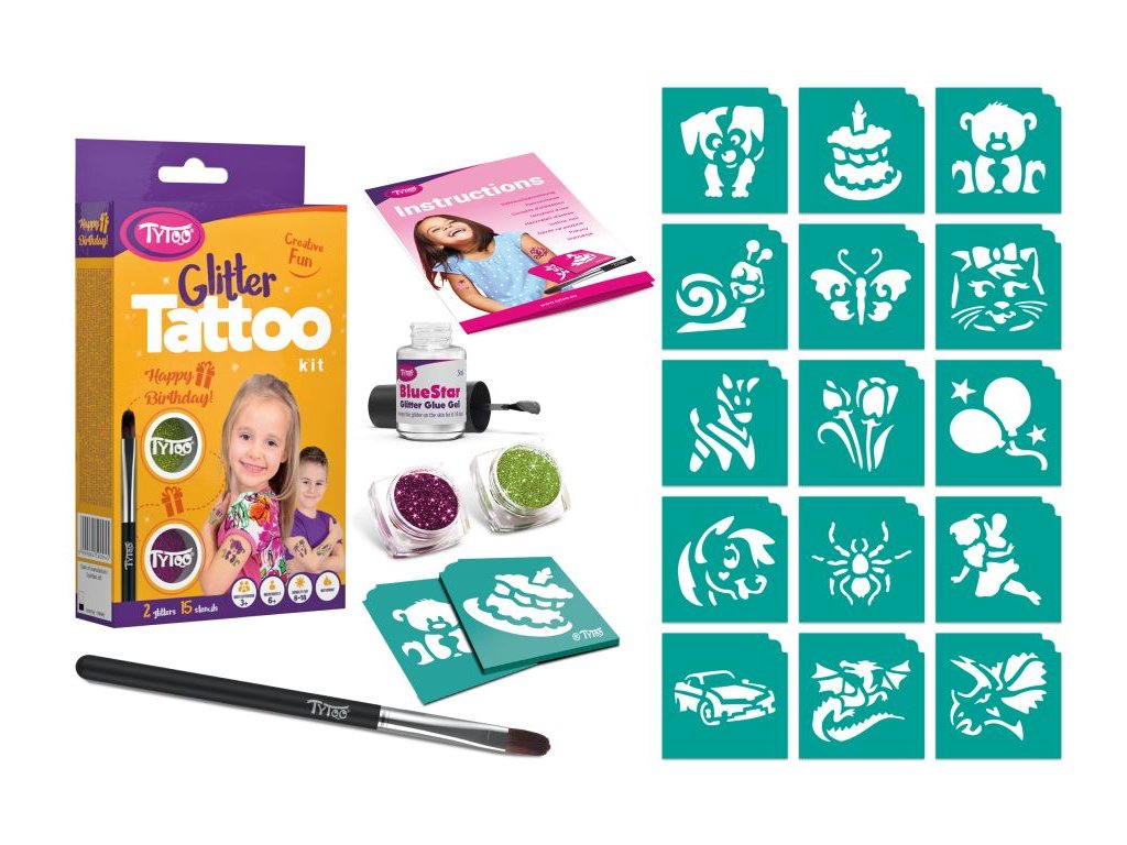 Vzory, které roztřpytí každou narozeninovou oslavu. Vzory: 15 ks. Barva: 2 ks. Vzor obvykle vydrží na kůži 8 – 18 dní. Délka této doby do velké míry závisí na typu kůže a míře opatrnosti, s jakou k tetování přistupujete. Třpytivé tetování je odolné vůči vodě, dá se však lehce odstranit alkoholem nebo dětským olejíčkem. Větší sady obsahují více nástrojů: Pohyblivé oči/samolepící kamínky: Hotový vzor můžete přizdobit. Naneste malé množství lepidla na samolepící kamínky a přitlačte jej na kůži. Přejeme vám hodně zábavy!