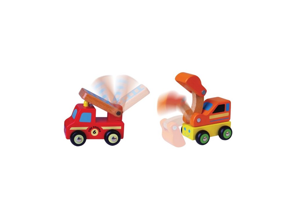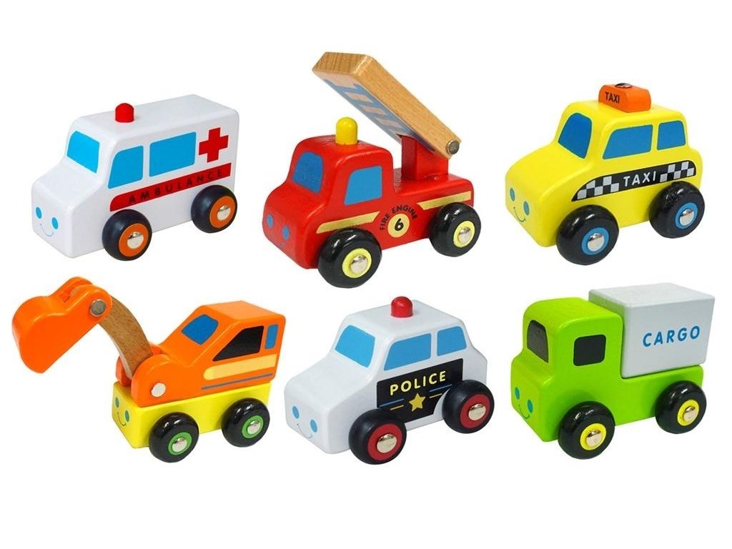 Sada 6 ks dřevěných autíček - taxi,ambulance,bagr,policie,požární auto,nákladní auto.