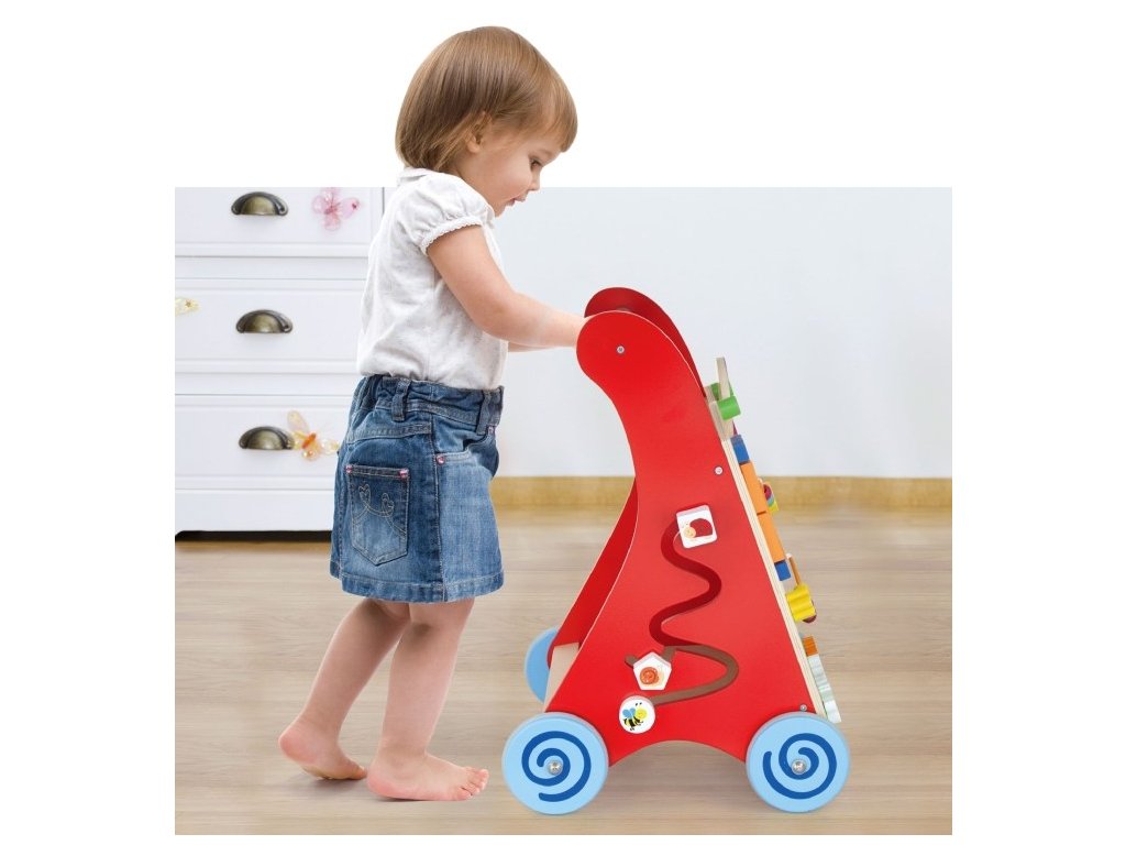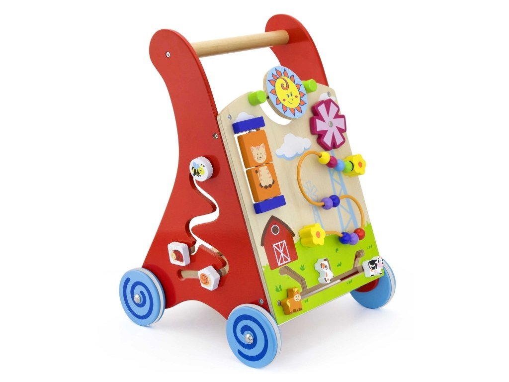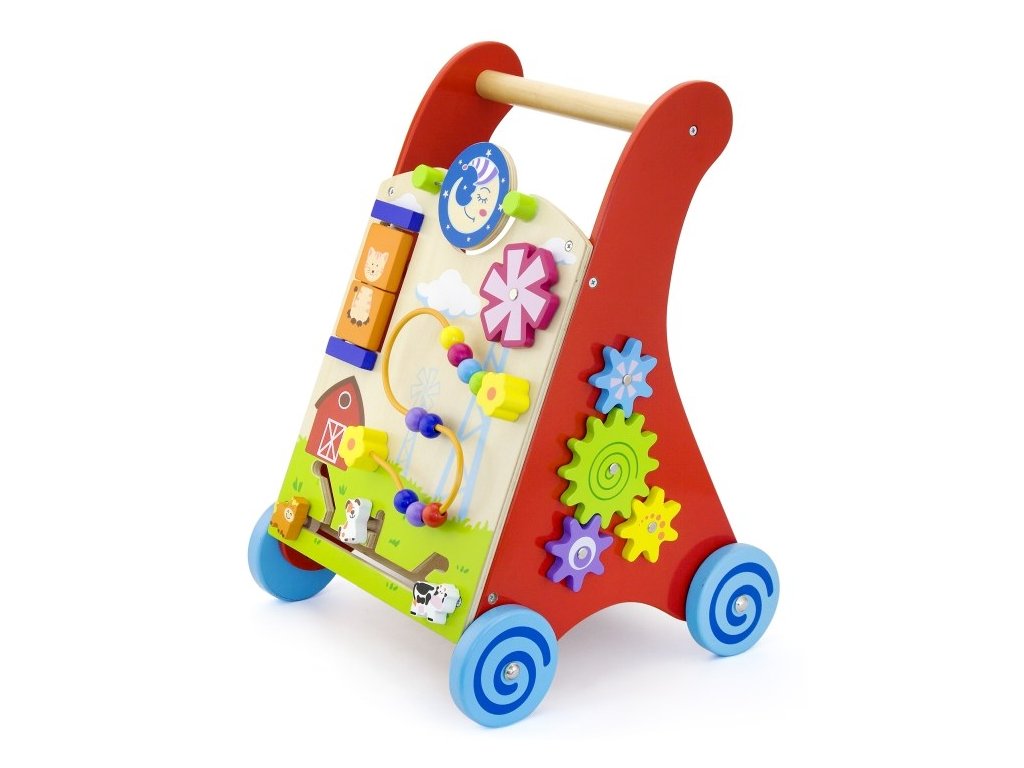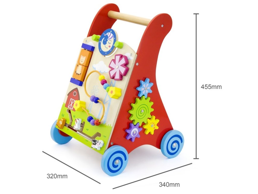 Dřevěné chodítko s herními prvky pro rozvíjení dětské chůze a motoriky. Toto dětské chodítko v kombinaci s různými hračkami. Včetně farmy a stopy, drátěné korálky, otočný větrný mlýn, otočný talíř slunce / měsíc na přední straně a ozubená kola, stopové a stopové bloky na stranách. Povzbuzuje kreativitu a dovednosti koordinace rukou a očí. Obsahuje různé provlékačky, bludiště a otáčecí hračky.
