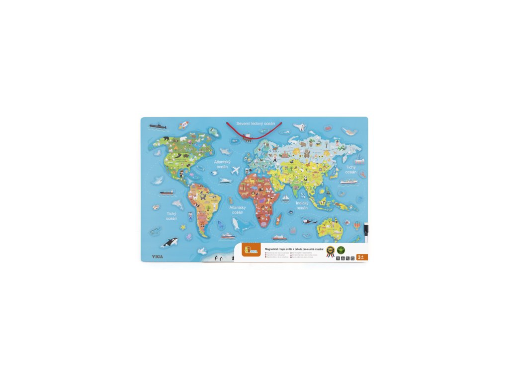 Dřevěná mapa světa s tabulí v českém jazyce. Mapa obsahuje mnoho magnetický dílků. Hraj si a poznávej všechny kouty světa. Druhá strana mapy slouží jako tabule na kreslení a psaní. Rozměry cca 72 x 46 x 0,7 cm. Věk 3+Doplňkové parametry
