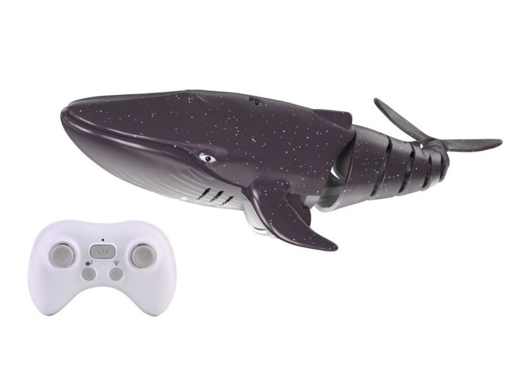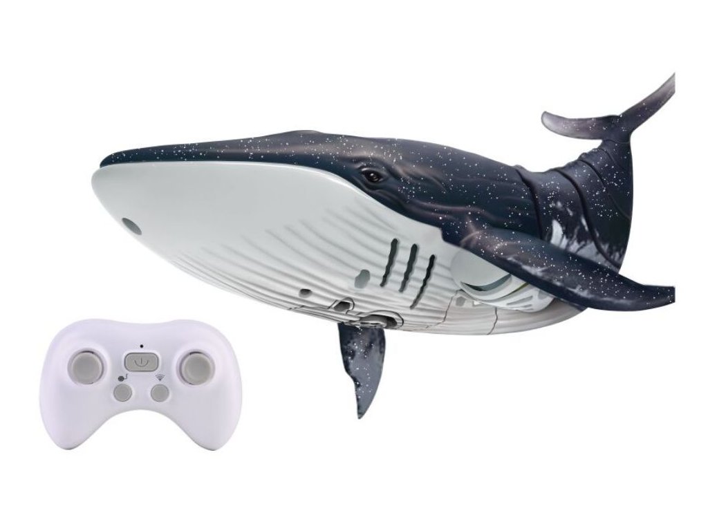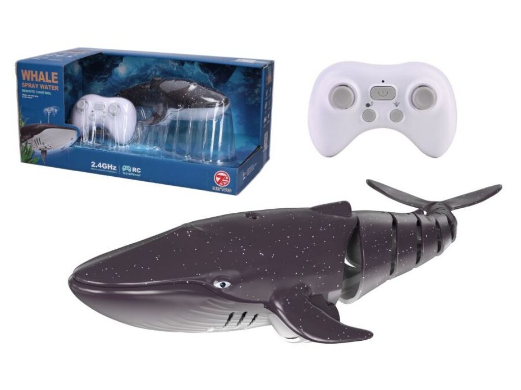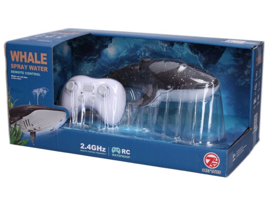 Velryba stříkající vodu RC na dálkové ovládání. Rozměry 35x12x8 cm. Frekvence 2.4GHz. Světelné efekty. 3.7V bateriový pack do velryby součástí, 2xAA do ovladače nejsou součástí. USB adaptér součástí. Ovladač - tlačítko ON/OFF, levé kulaté tlačítko - demo režim, pravé kulaté tlačítko - vodotrysk.