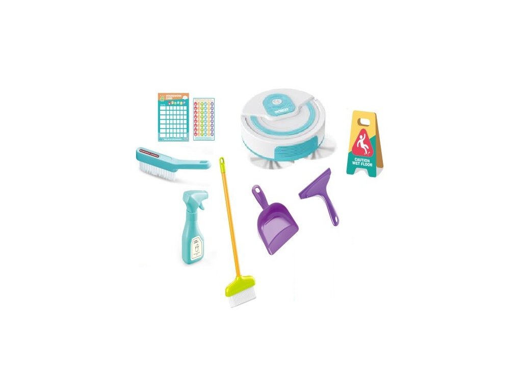Uklízecí set. Obsahuje robotický vysavač 17cm, smeták, lopatku se smetáčkem, stěrku, lahvičku s rozprašovačem, ceduli pozor mokrá podlaha, kartičku s nálepkami.