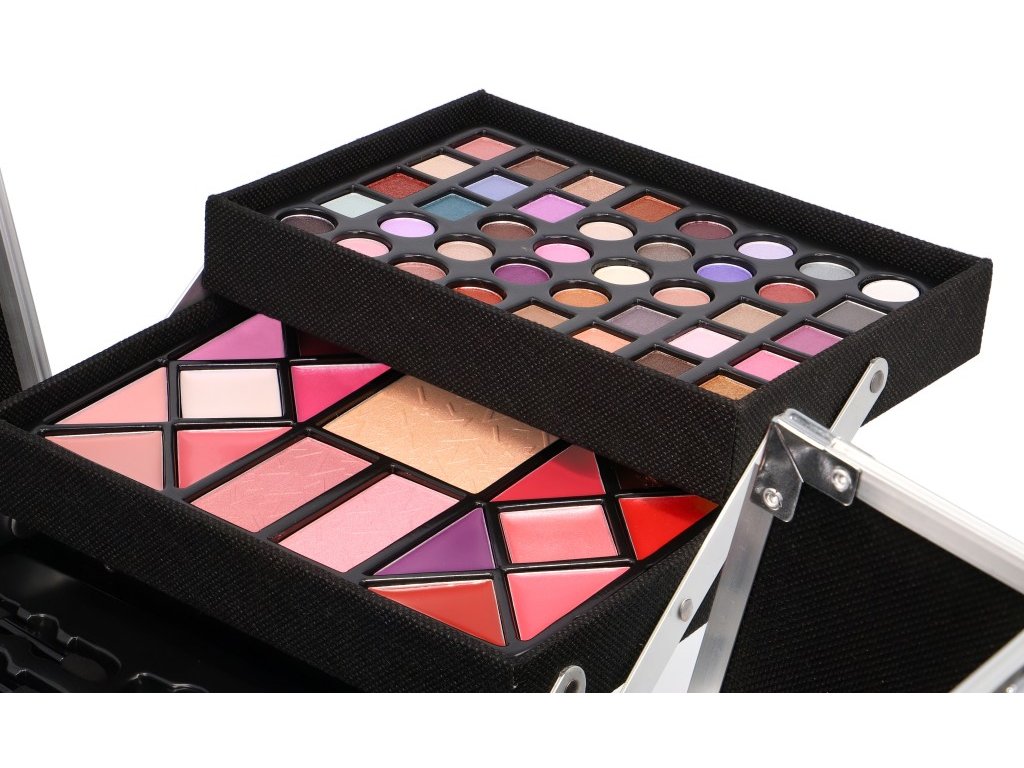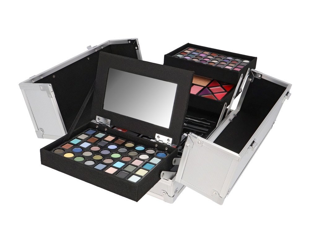 Velký kosmetický hliníkový kufřík – celkem 113 ks příslušenství. Obsahuje 80× očními stíny, 14× lesk na rty, 3× tvářenka, 3× lak na nehty, 2× rtěnky, 1×pudr, 1× tužka na oči, 1× řasenka, 1× linka,1× tužka na rty, 5× aplikátory/štětce a integrované zrcátko. Dermatologicky testováno, vyhovuje přísným normám EU.