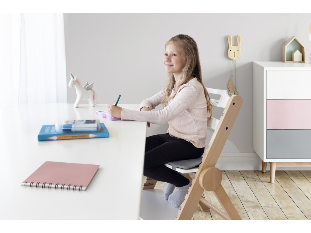 Díky inovativnímu systému Clipp & Clapp lze židličku jednoduše přizpůsobit výšce bez potřeby nářadí. Jako jedna z mála dřevěných židliček na trhu lze složit, což díky kompaktním rozměrům po složení umožní snadné skladování a madlo zase usnadní přenášení židličky.