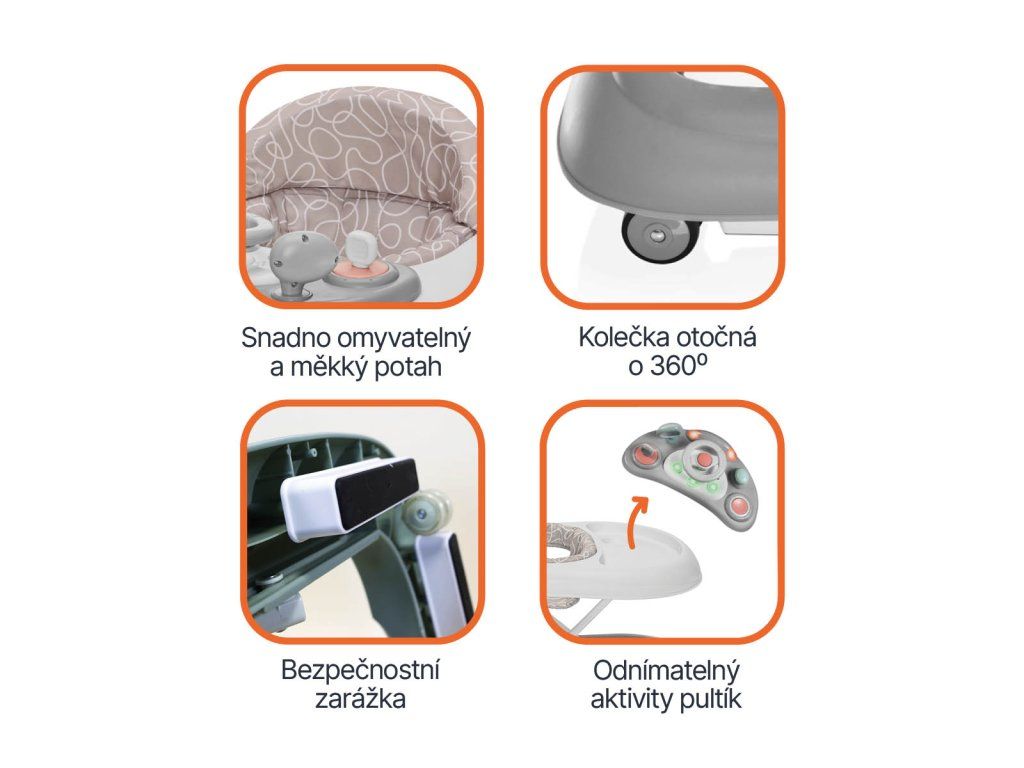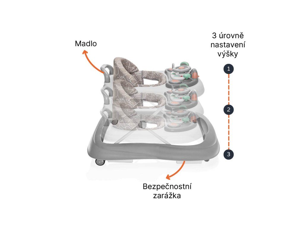 Díky nastavitelnému sedátku ve 3 výškových polohách roste chodítko spolu s dítětem. Zadní madlo navíc umožňuje dítěti trénovat první krůčky i ve stoje – může se bezpečně opřít a postupně získávat jistotu.
