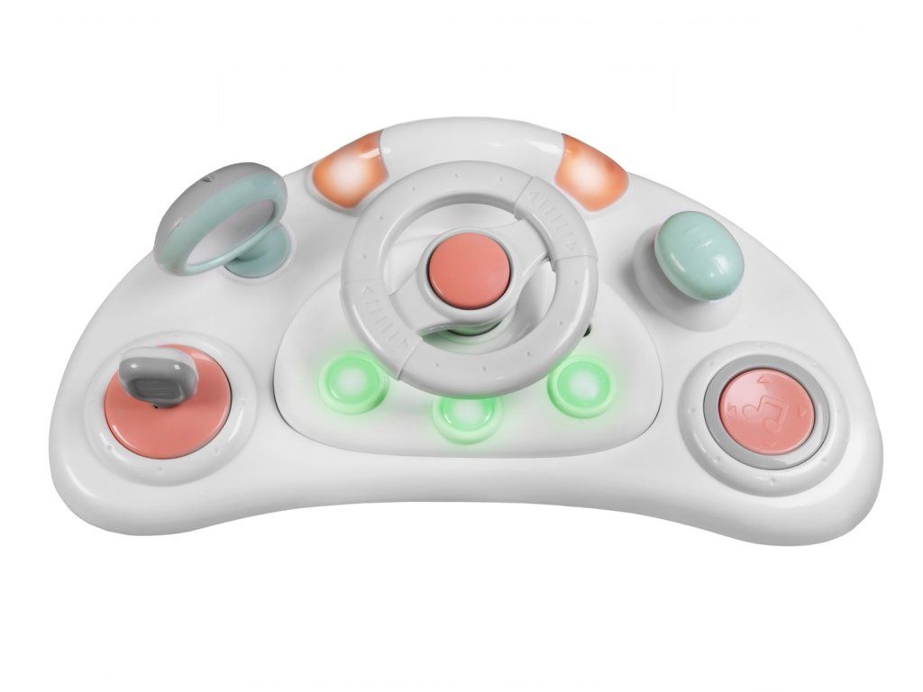 Součástí chodítka je odnímatelný interaktivní pultík plný podnětů. Nabízí světelné efekty veselé melodie i zvuky auta a nechybí ani otočný volant a další hravé prvky. Dítě tak nejen trénuje chůzi ale zároveň rozvíjí své smysly koordinaci i jemnou motoriku.