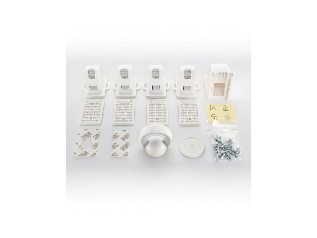 Balení obsahuje 4 ks uzávěr, šablonu pro snadnější montáž, magnetický klíč, kvalitní lepicí pásku 3M, sadu šroubků a infonálepky pro přesné přiložení magnetického klíče. Součástí balení je i závěsný držák určený k odložení klíče, abyste ho měli vždy po ruce.