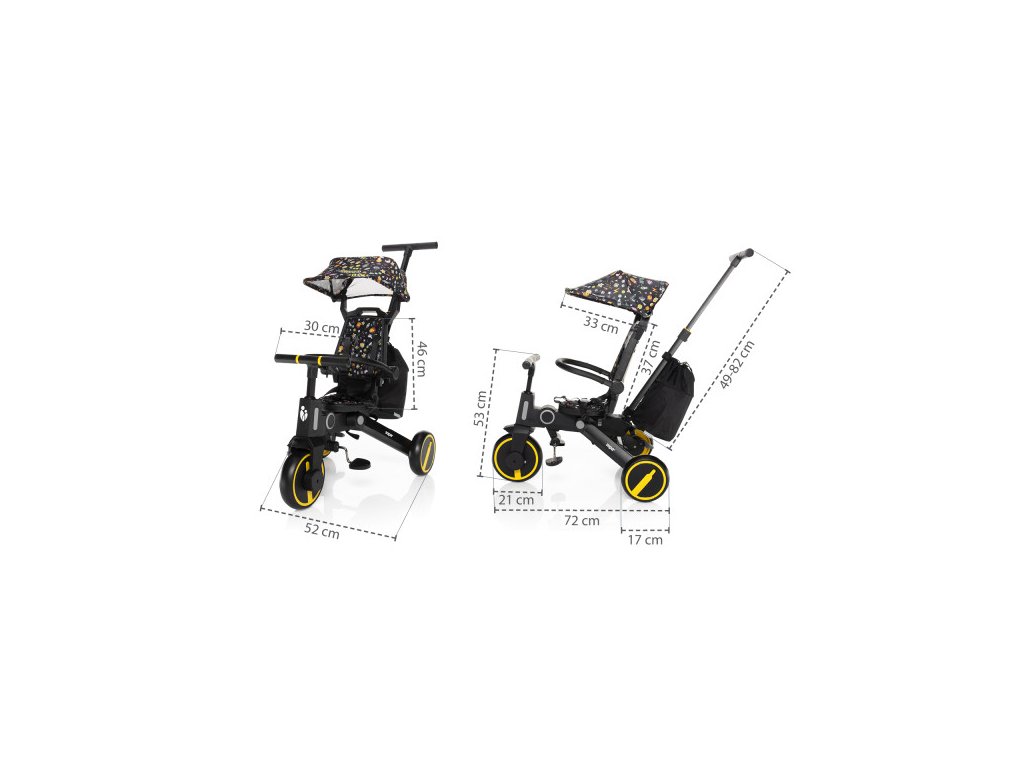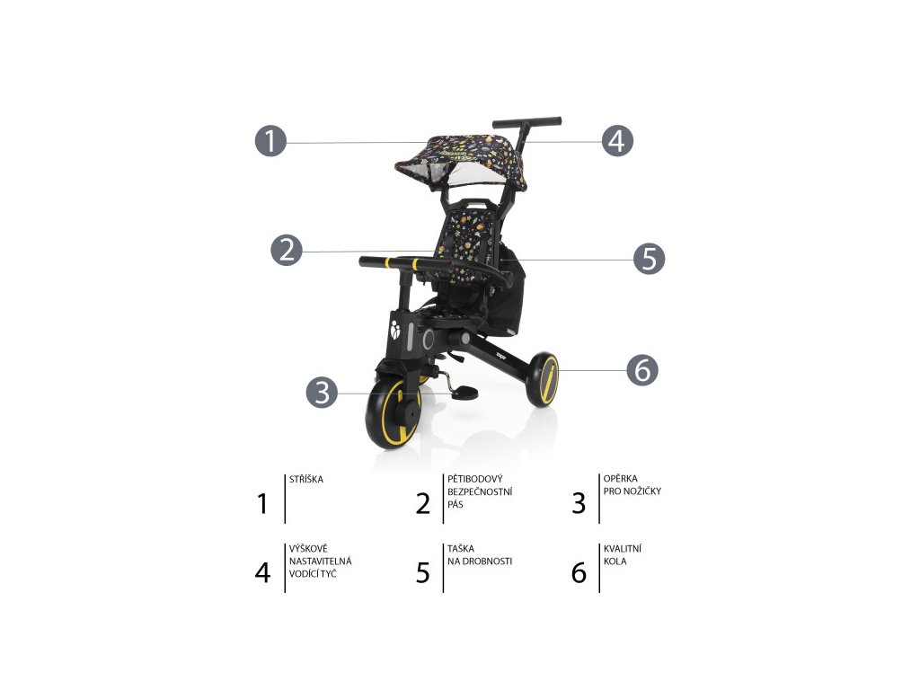 Tříkolka je pohodlnější alternativou ke kočárku a zároveň mezikrokem k odrážedlům a kolům. Díky výškově nastavitelné vodící tyči a funkci vypnutí řídítek plně nahradí kočárek a dítě si při jízdě užije více zábavy. Odnímatelná šlapátka se dají využít jako pedály, kdy dítě řídí tříkolku samo, nebo pro menší děti jako opěrka nohou. Komfortnější jízdu má na starost podsedák i opěrka zad, ty jsou opatřeny polstrováním, jenž je odnímatelné pro snadnější čistění.