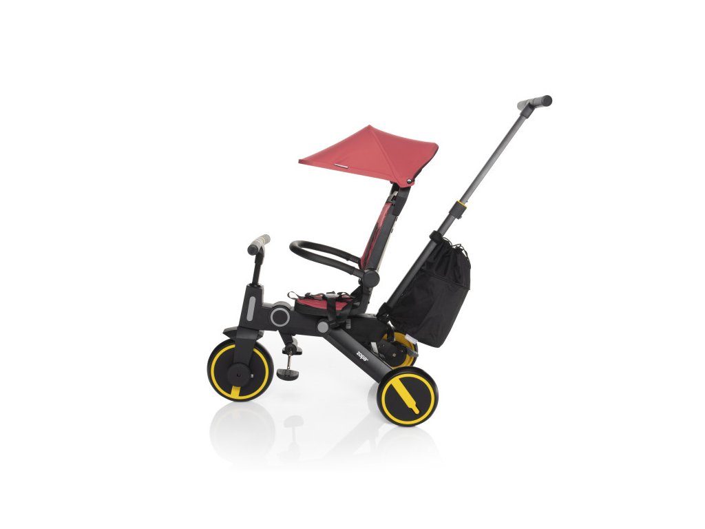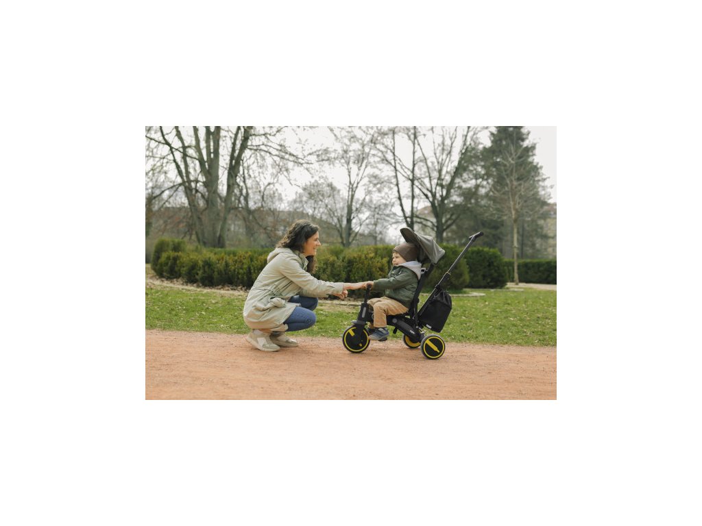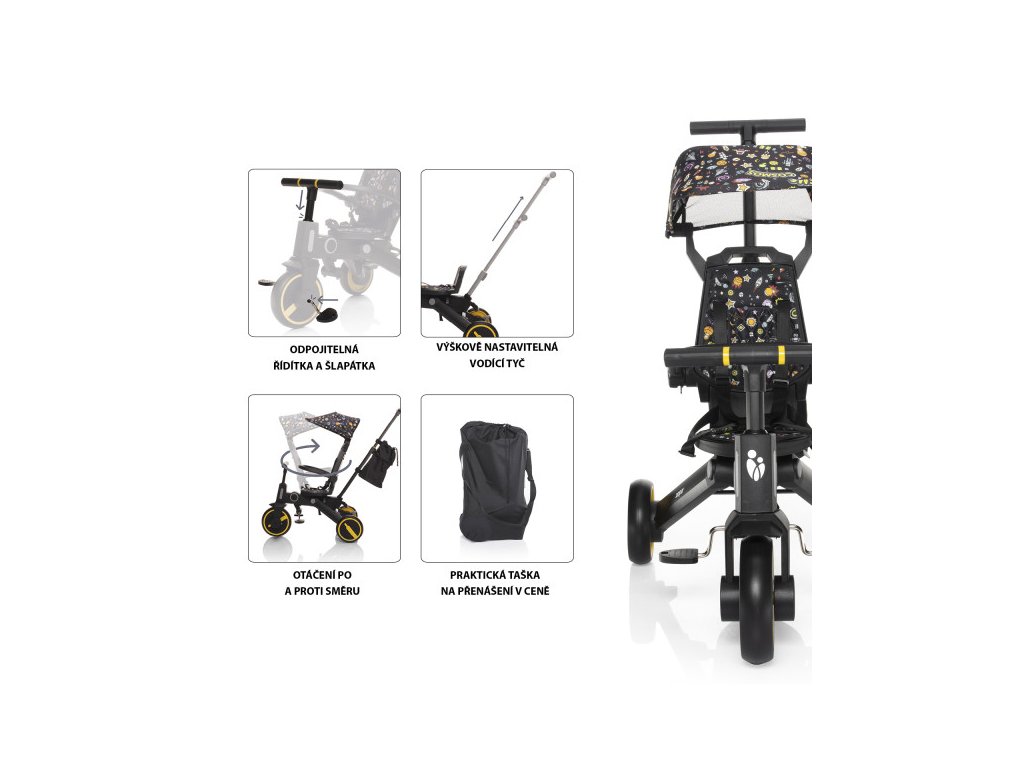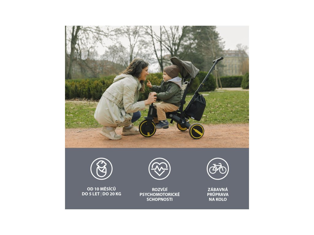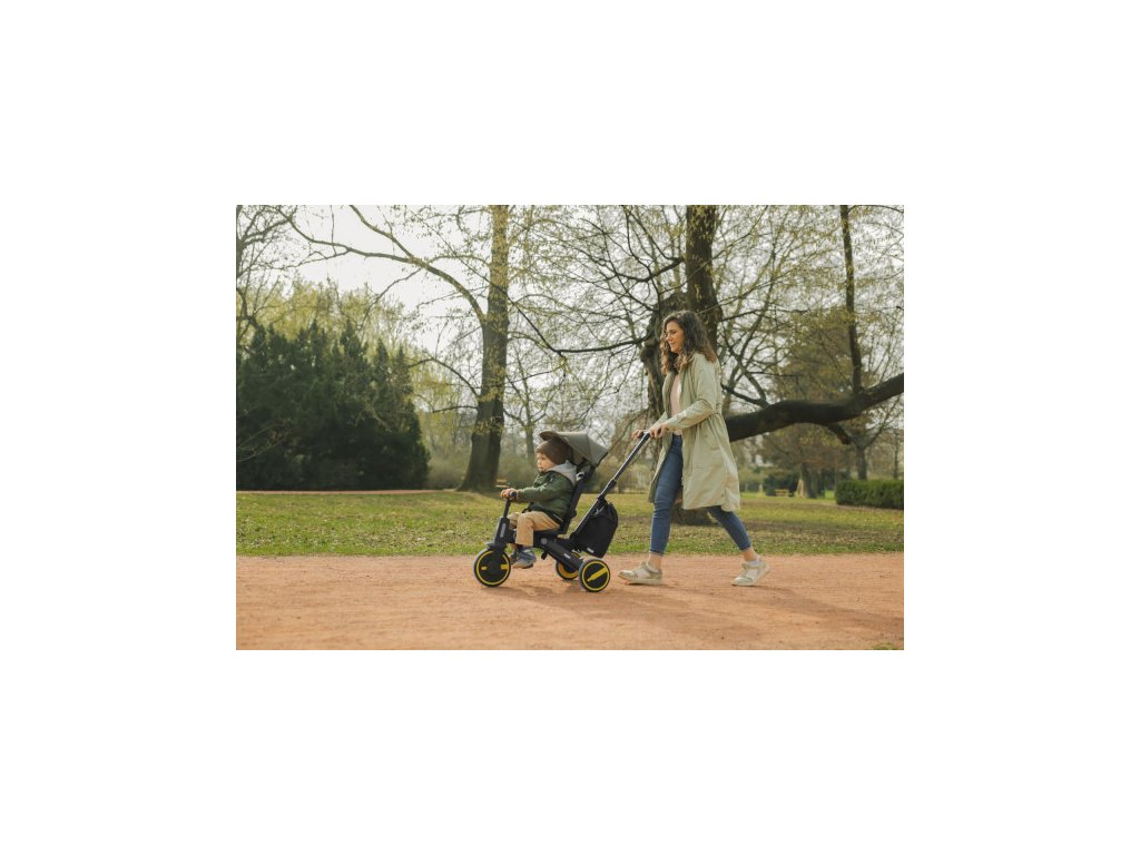 Tříkolka je pohodlnější alternativou ke kočárku a zároveň mezikrokem k odrážedlům a kolům. Díky výškově nastavitelné vodící tyči a funkci vypnutí řídítek plně nahradí kočárek a dítě si při jízdě užije více zábavy. Odnímatelná šlapátka se dají využít jako pedály, kdy dítě řídí tříkolku samo, nebo pro menší děti jako opěrka nohou. Komfortnější jízdu má na starost podsedák i opěrka zad, ty jsou opatřeny polstrováním, jenž je odnímatelné pro snadnější čistění.