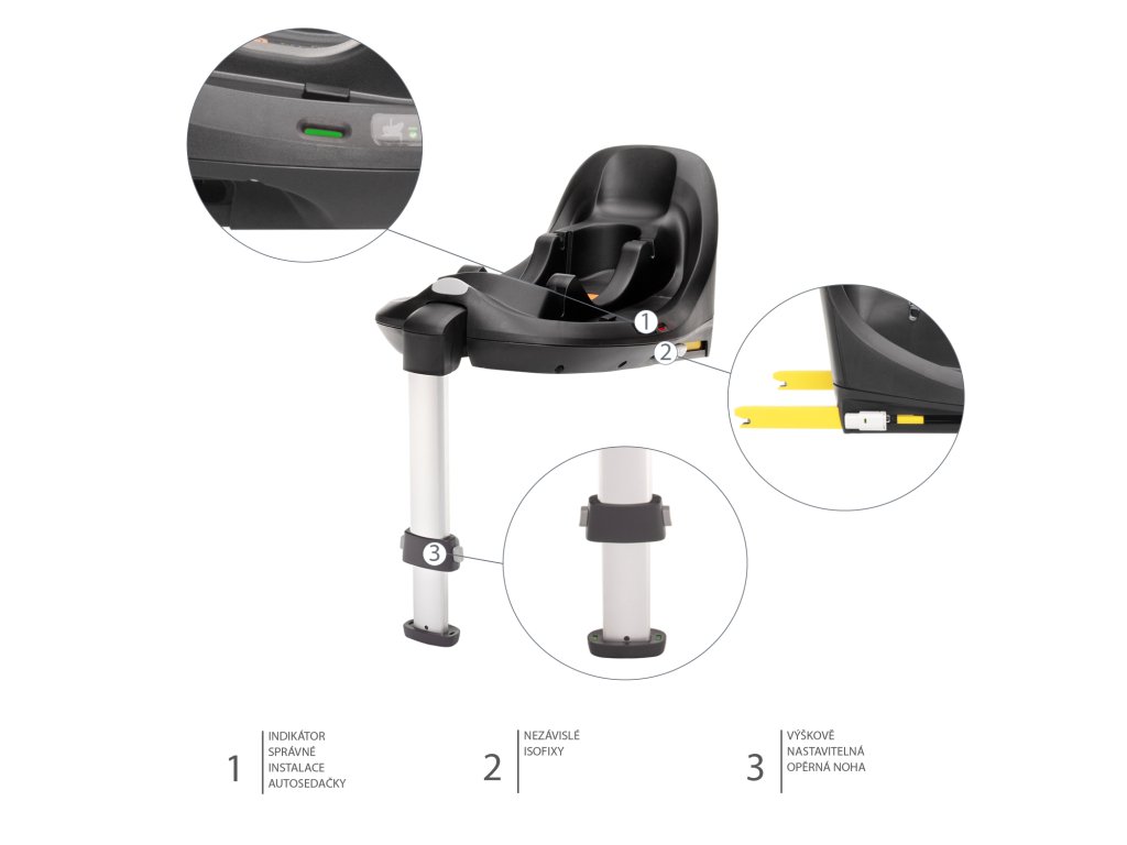Nezávislé ISOFIX s indikátory pro snadnou a bezpečnou instalaci autosedačky do vozidla. Autosedačka disponuje opěrnou nohou, která přidává další bod pro větší stabilitu i opěrná noha má svůj indikátor správného nastavení. Lepší stabilitu zajistí také bezpečnostní oblouk. Správnou instalaci autosedačky na základnu vám potvrdí indikátory správné instalace. Sejmutí autosedačky ze základny jednoduše přes pojistku.