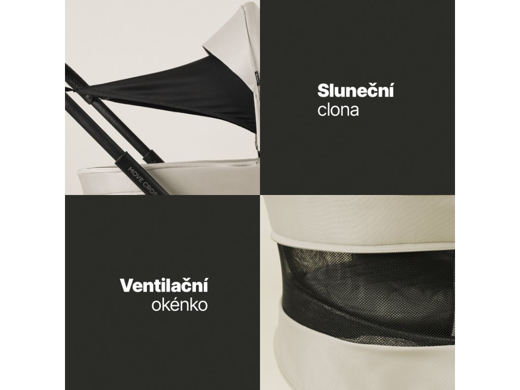 Korba Move Cross 5 XL se nasazuje přímo na podvozek bez adaptérů, váží jen 3,9 kg a je vybavená měkkou matrací i prodloužitelnou stříškou. Díky ventilačnímu systému je vhodná do každého ročního období.